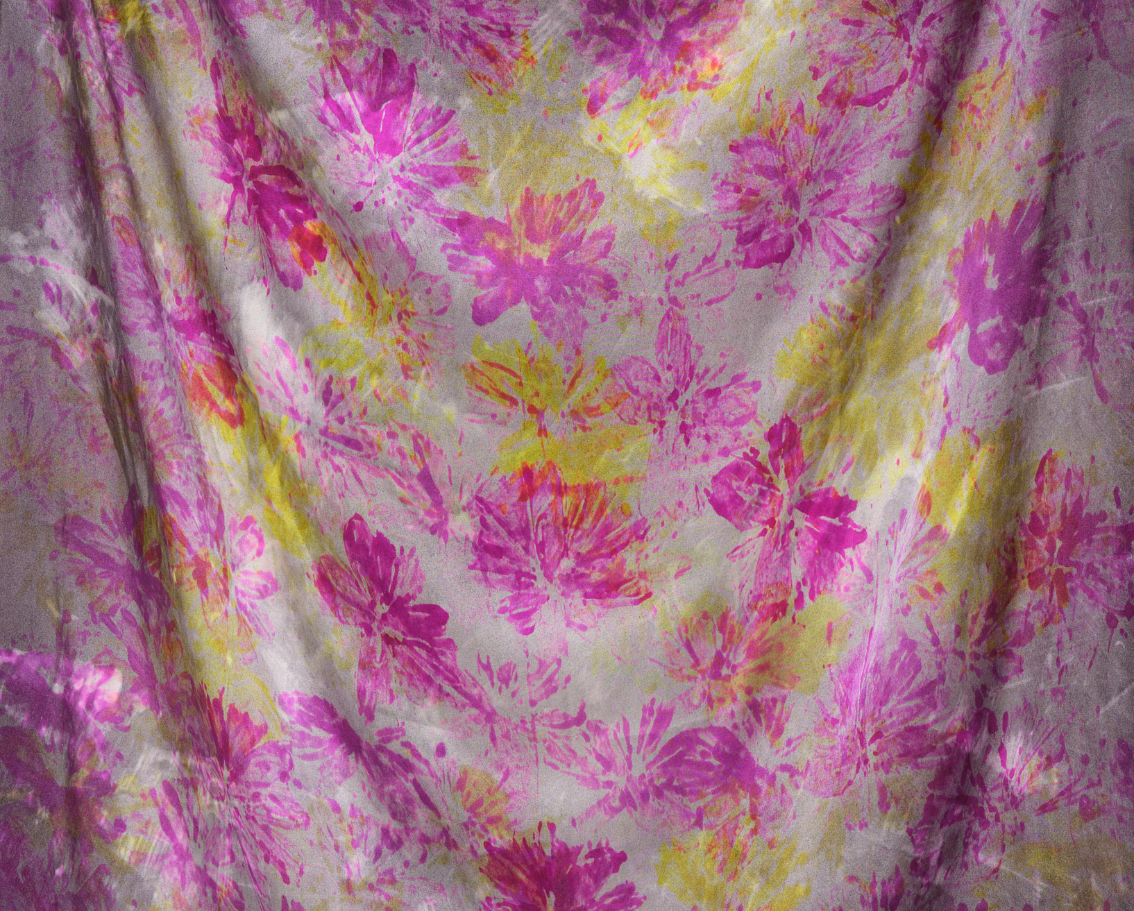 A shift from the intricate illustrations of the Quadrello scarves, the newest scarves from Avant Toi feature a floral stamp pattern layered in orchid purple and lime green.