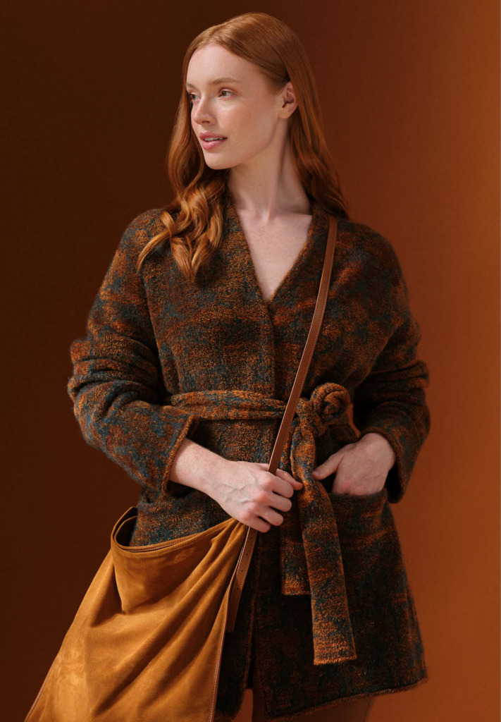 Hand-Knit Cashmere Belted Cardigan in Green & Copper Brown
