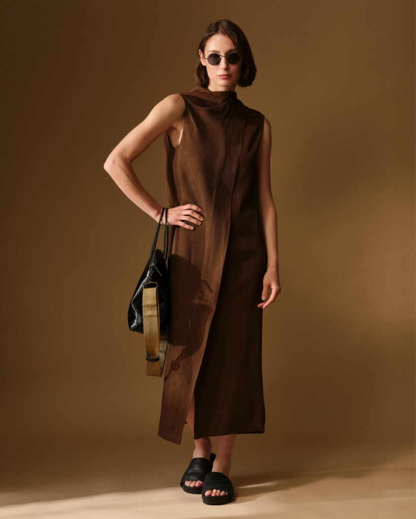 Washed Silk Spicchi Colletto Collared Dress in Dark Bronze