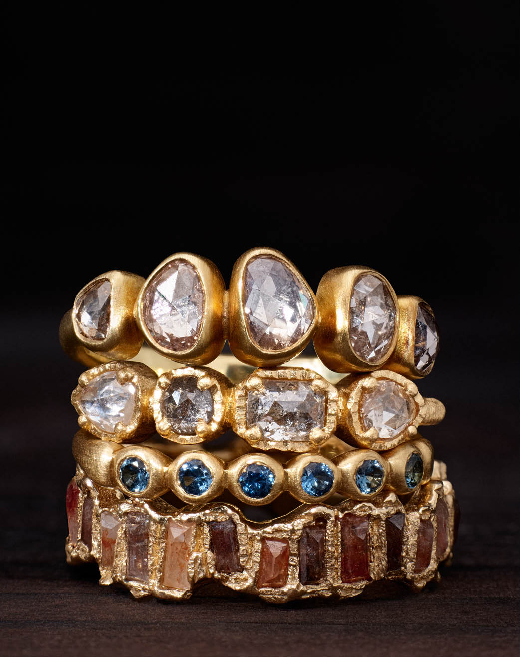 14K Hammered & Oxidized Gold Tsubu Ring with Rose Cut Diamonds