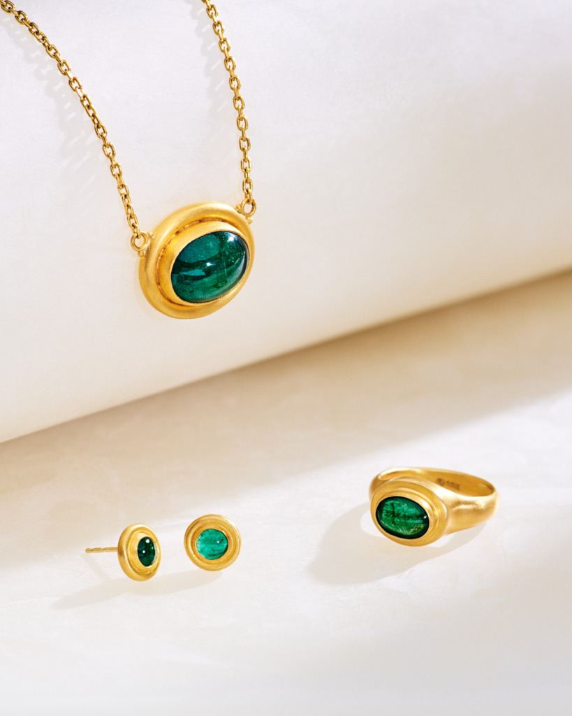 Rendered in cabochon and faceted stones, Denise Betesh’s blue sapphires are saturated with color and beautifully set in matte 22K recycled gold.