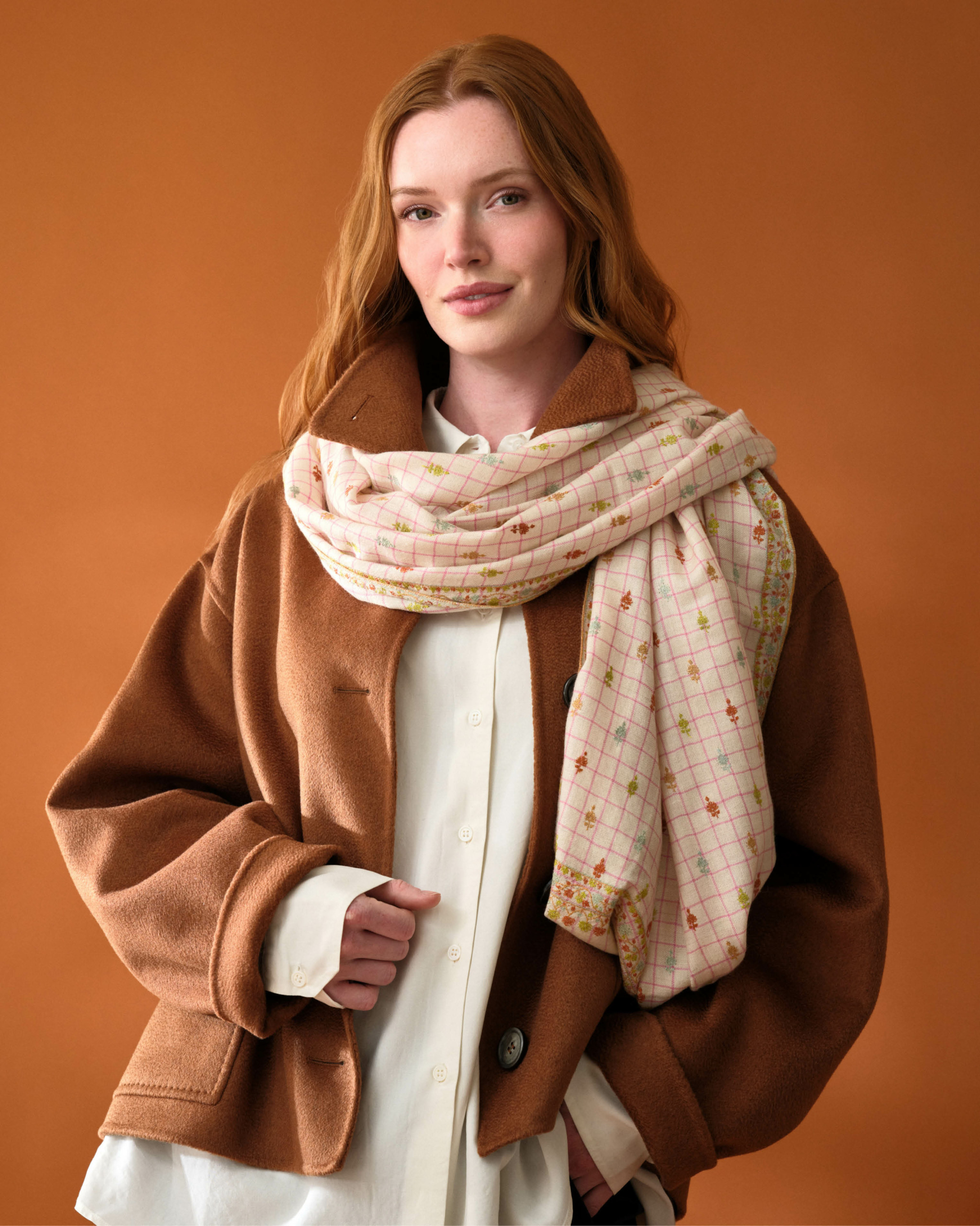 Cashmere Kashmiri Embroidered Scarf in Cream & Pink Windowpane with Paisley Flowers