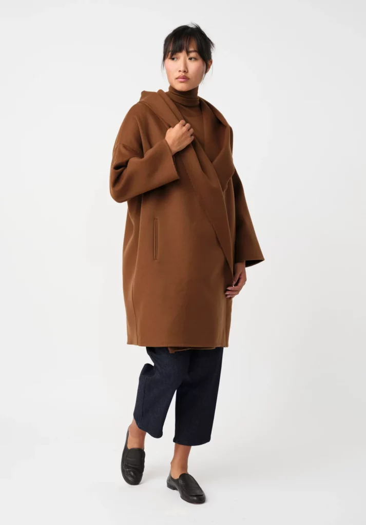 Felted Cashmere Blend Belted Paola Wrap Coat in Camel Brown