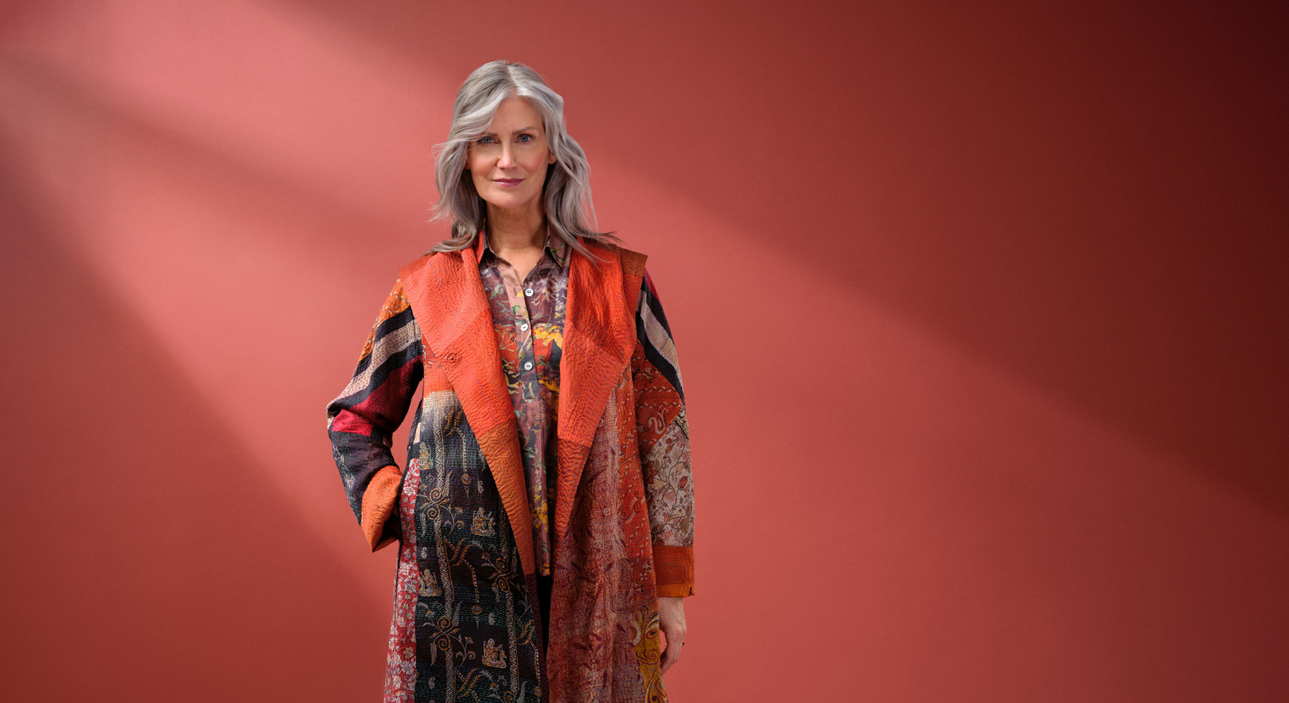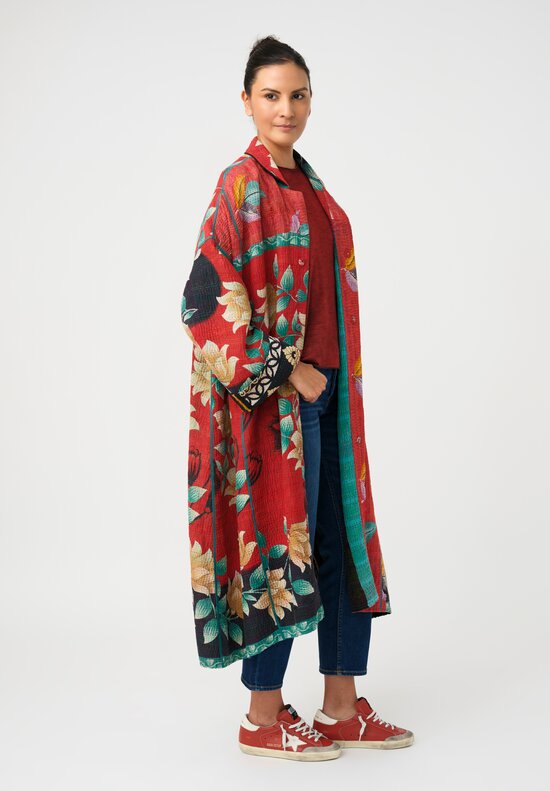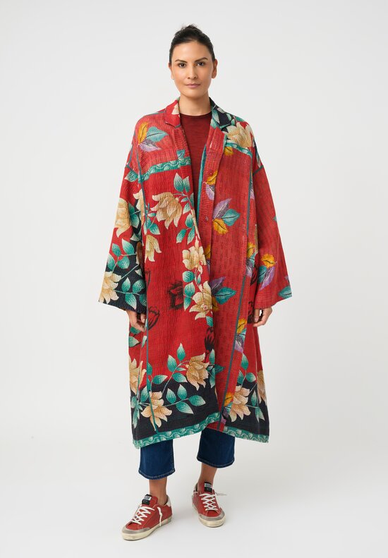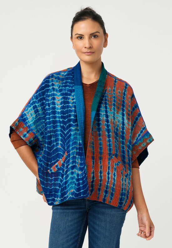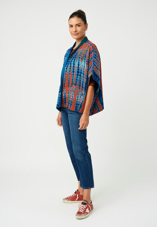 Mieko’s jackets are an amalgam of fine vintage sari cloth selected by Mieko twice a year in Western India and her own signature fabrics. Kantha means “simple stitching” in Hindi and is a time-honored tradition in South Asia. It is defined by the long-running stitch that bonds two or more sari fabrics together. In the case of Mieko’s jackets, the Kantha stitching is done by women in a small cooperative in West Bengal who need up to 5 months to complete their meticulous work.