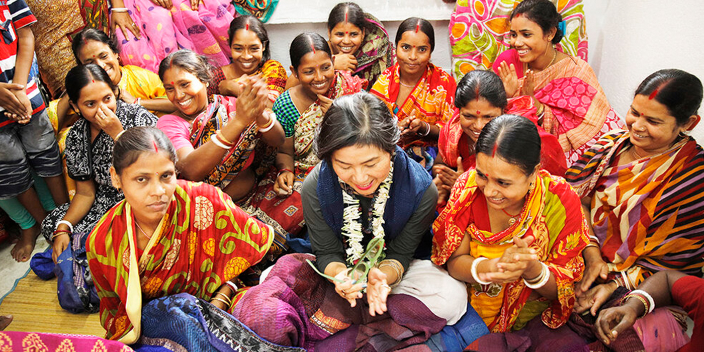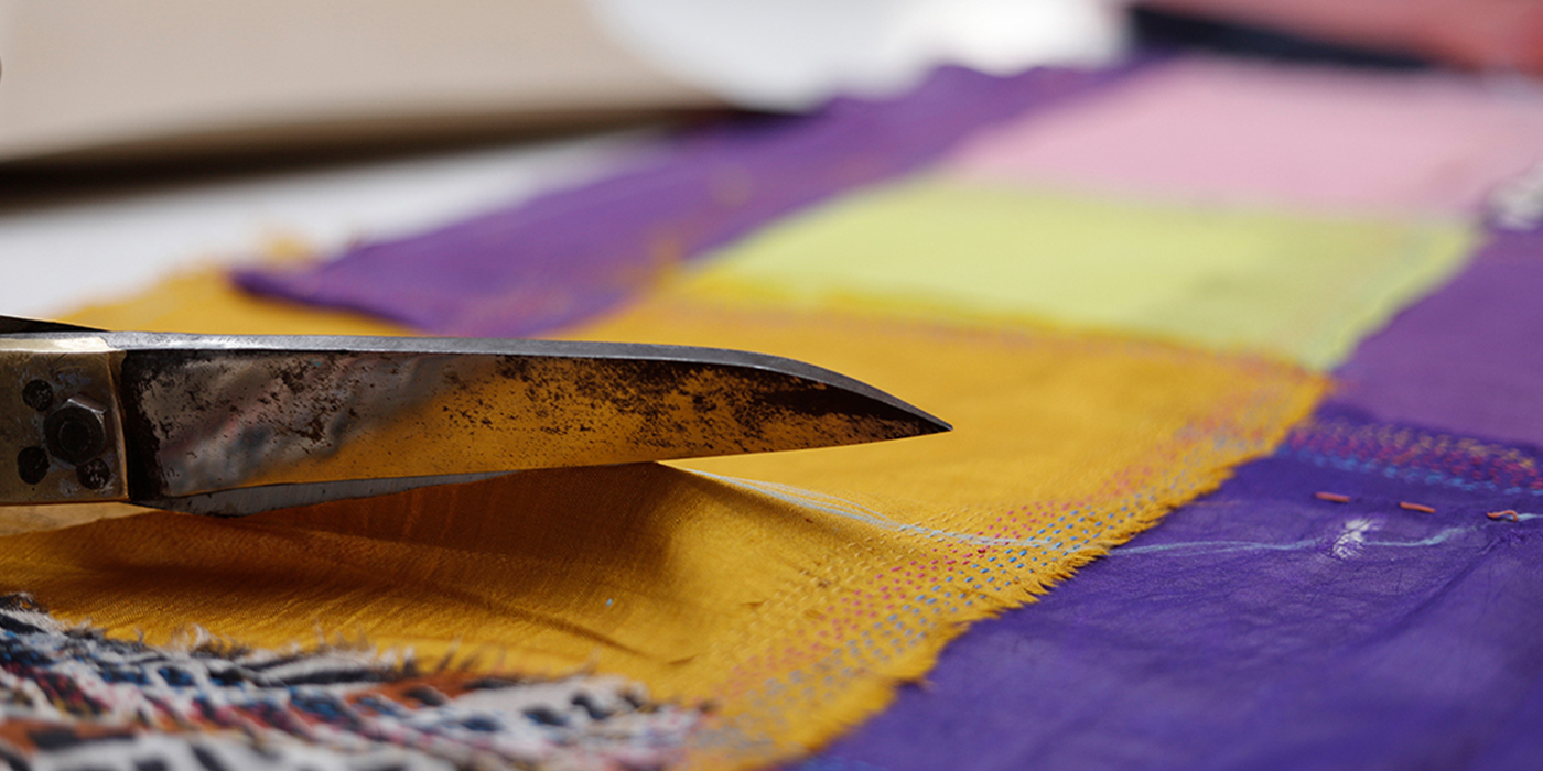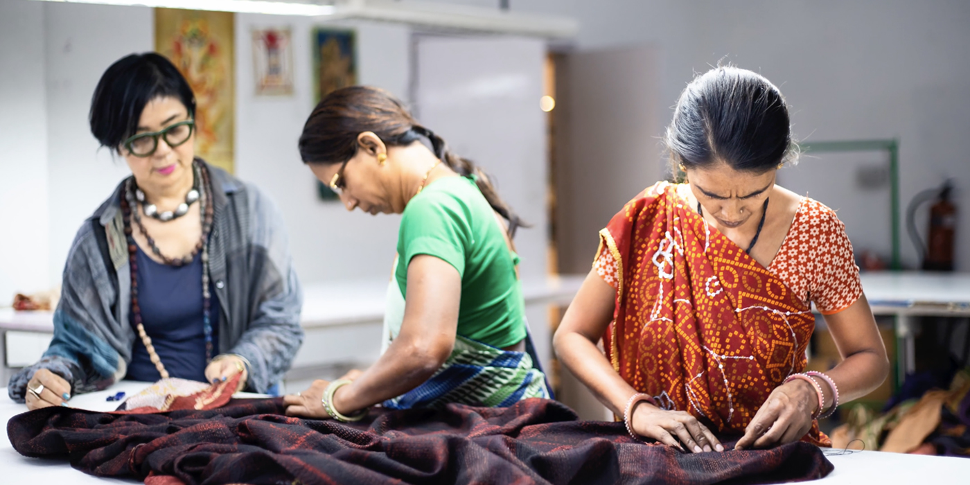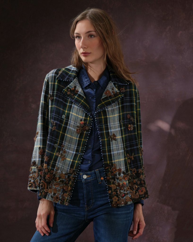 Mieko’s jackets are an amalgam of fine vintage sari cloth selected by Mieko twice a year in Western India and her own signature fabrics. Kantha means “simple stitching” in Hindi and is a time-honored tradition in South Asia. It is defined by the long-running stitch that bonds two or more sari fabrics together. In the case of Mieko’s jackets, the Kantha stitching is done by women in a small cooperative in West Bengal who need up to 5 months to complete their meticulous work.