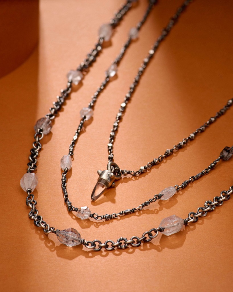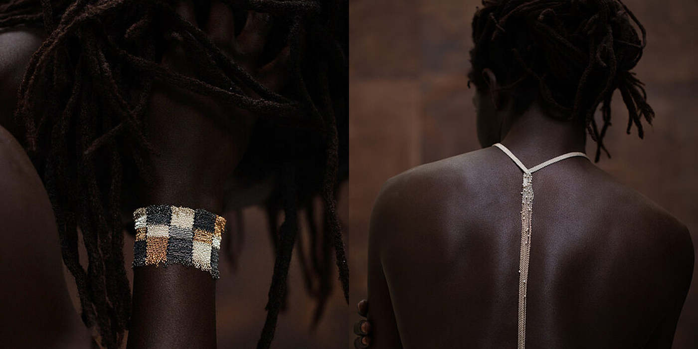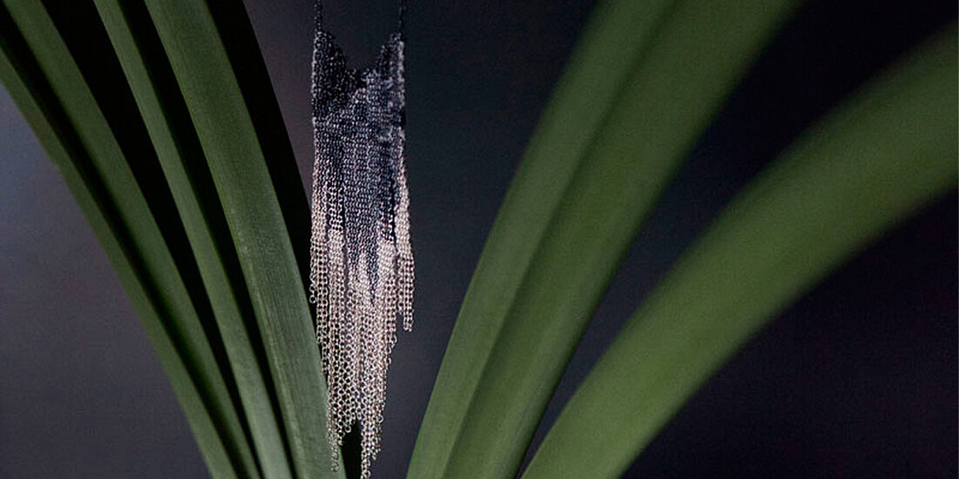 Now based in Antwerp, Stephanie has evolved her unique process to create jewelry that echoes the structure of fabric. Always working with the same type of silver chain, at times plated in gold, she connects the chains by weaving in silk thread, linen or mohair yarn. Her pieces remain immediately recognizable, infinitely wearable and refreshingly seasonless.