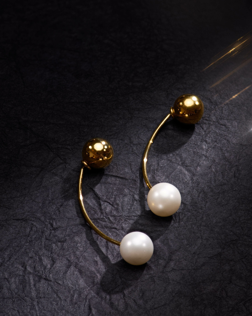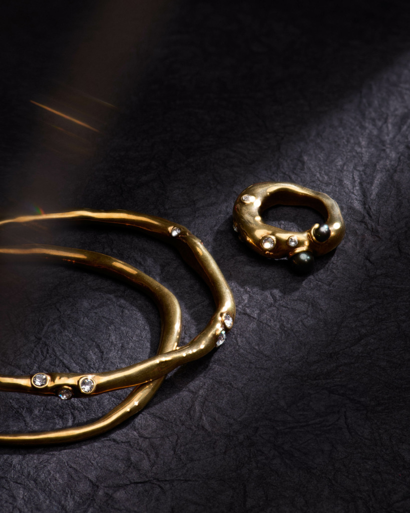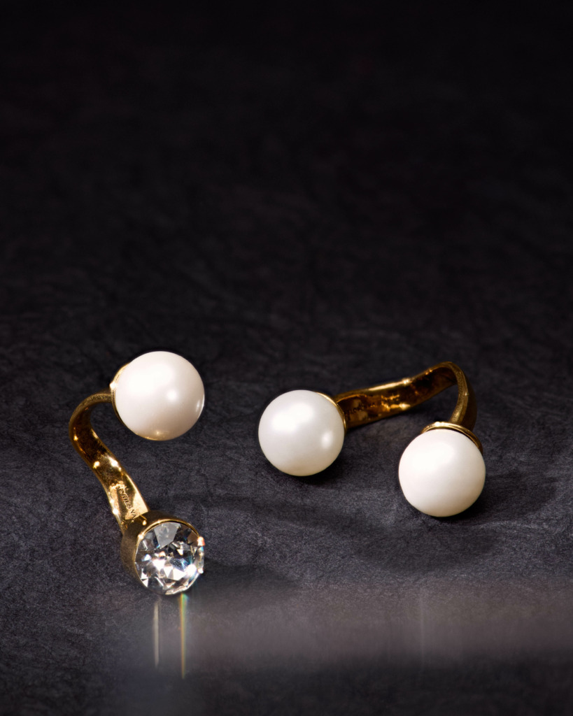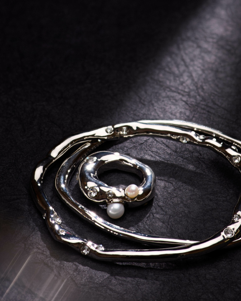 High-optic strass jewels embed the pieces, complemented on several of the rings by creamy pearlescent studs. The accents are placed organically, the design akin to ore-dotted rock or rare, deep sea coral.
