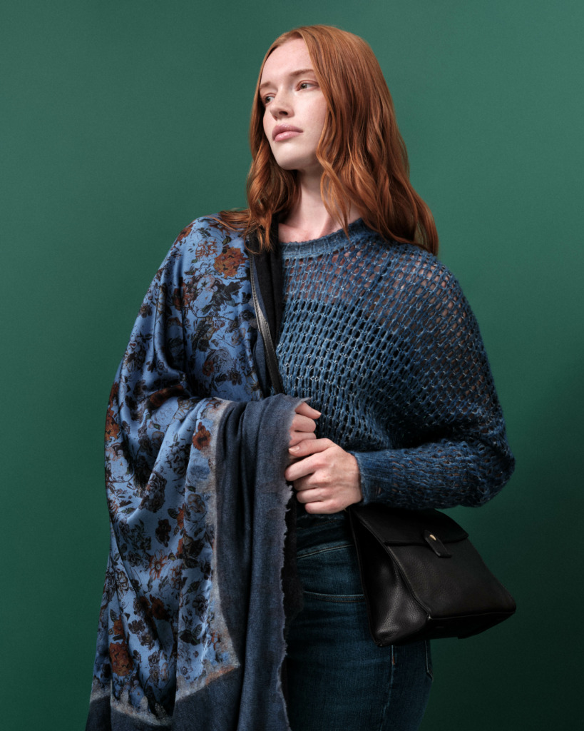 If floral is your flavor, the Avant Toi Cashmere & Silk Quadrello Nero Floral Scarf is an excellent option, in Ambra Brown, Verderame Green, Ginepro Blue and Sichuan Purple.