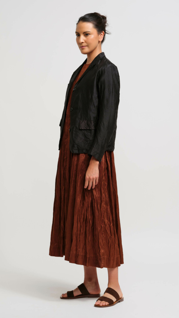 Founder and designer Junji Koike works from the Christian Peau studio in Kobe, Japan, a harbor city nestled between Osaka Bay and the Rokko mountain range. Junji crafts his garments with incredible skill and attention to subtle details, such as a silk skirt with a pair of ribbon suspenders that double as a drawstring. The dresses, jackets and tops in this collection are tailored with a breezy silhouette, making them perfect for warmer days.