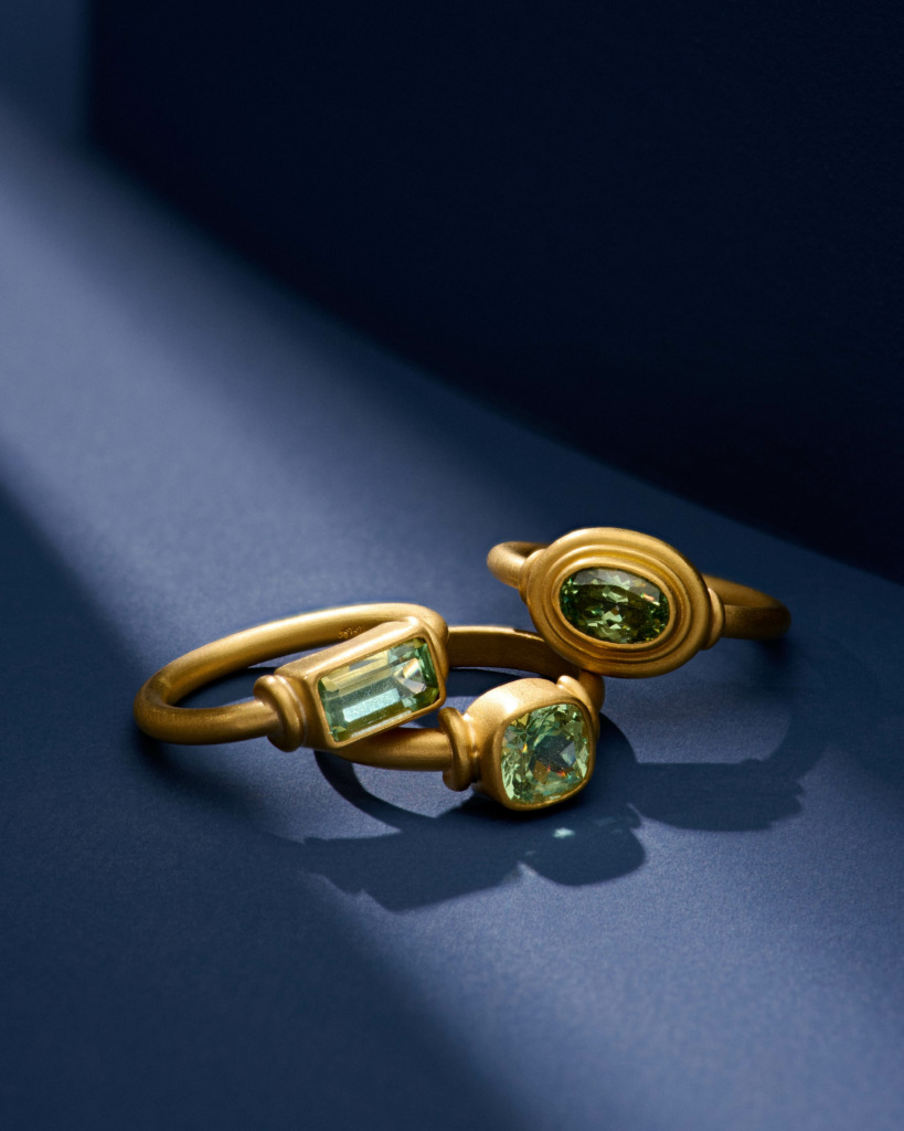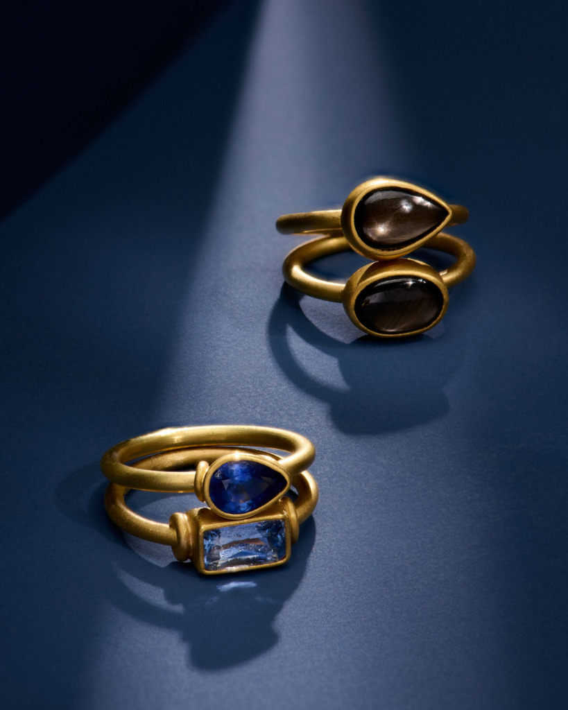 Core to jewelry collection is a selection of stackable rings set with richly colored stones such as tangy tsavorite and chocolate star sapphire. The latter is of particular note—not only is this a rare varietal within Denise Betesh’s collection, but the cabochons hide a secret star that is revealed with direct light.