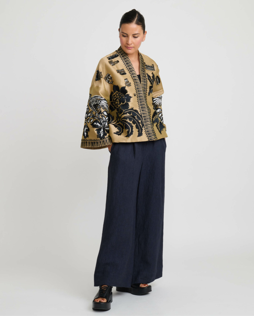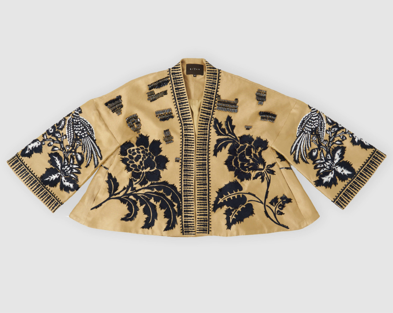 His most subtle piece is the Kalepia jacket, wherein Biyan lets black and white embroidery flourish across taupe silk.