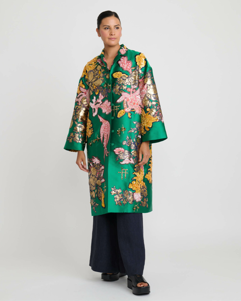 His Rendara style, a beaded and sequined emerald coat, is a panache of creativity. Glitter, gold and green meld together into a piece equal parts charisma and poise. The variety of embroidery across this piece plays with the viewer’s depth of field – a nod to Biyan’s penchant for costumery.