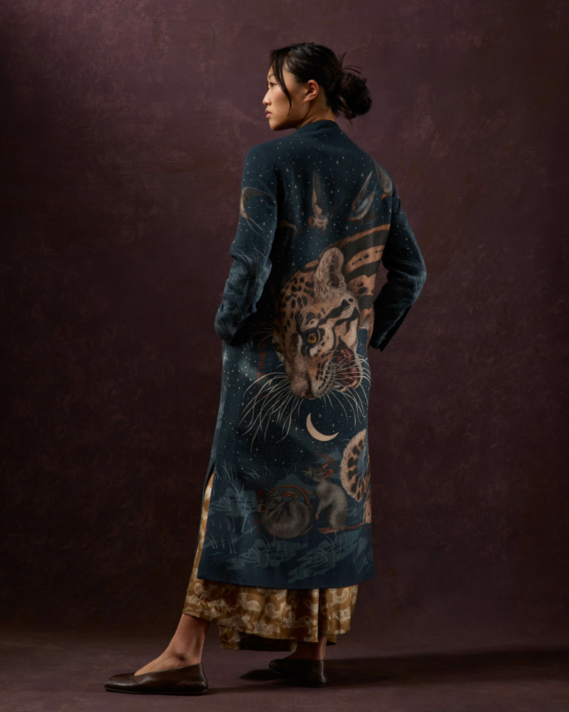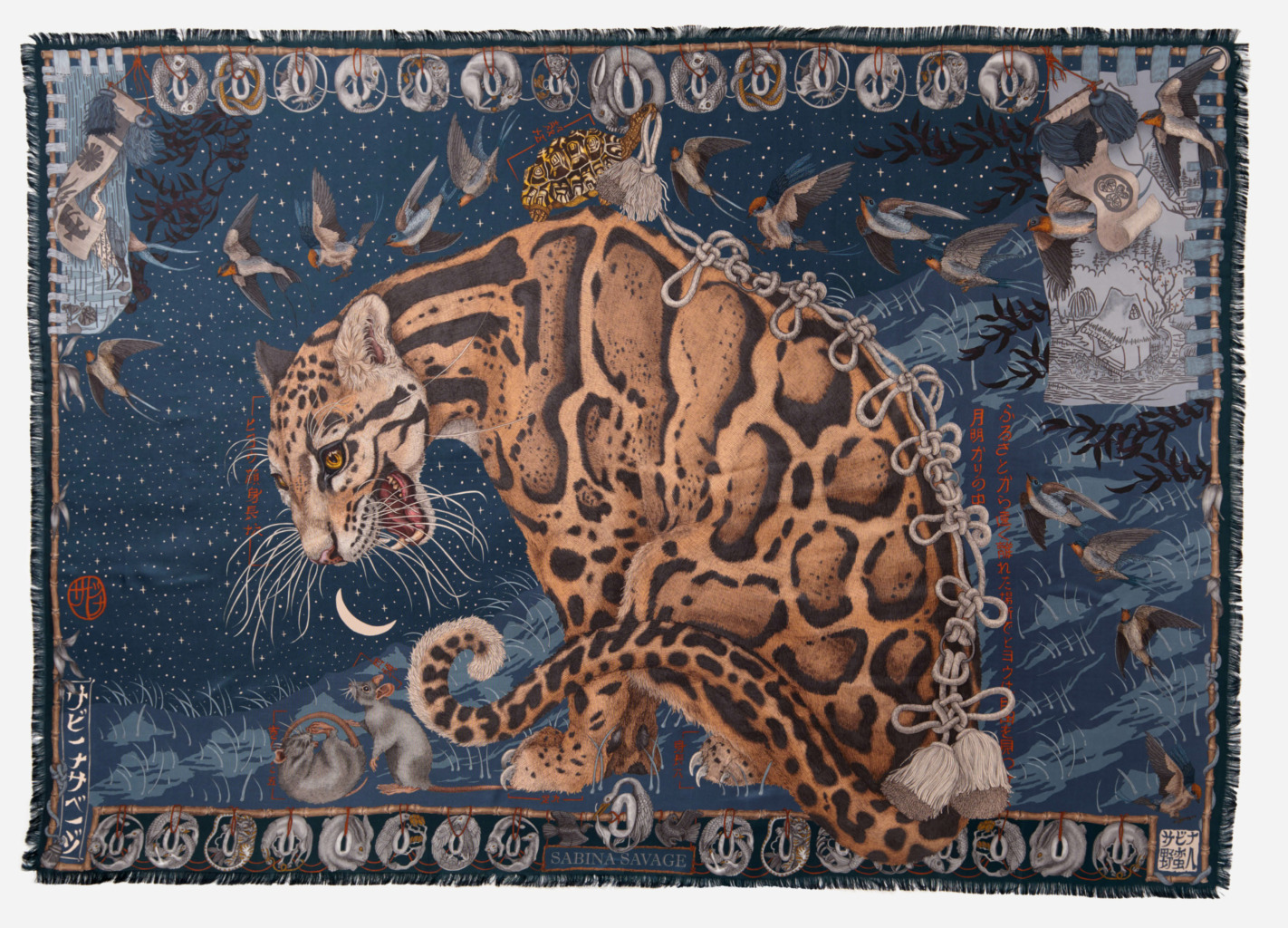 “The clouded leopard flees until he can run no further. Under the gently rippling willow and flags of Tango No Sekku, he takes pause on a hillside. His tortoise companion attempts to disguise their presence with samurai tassels, while the ship rats emulate the rounded shapes of the tsuba. It is the fifth night of the fifth moon in the lunisolar calendar, and a flight of swallows announces the outsiders’ presence under the sparkling sky.”