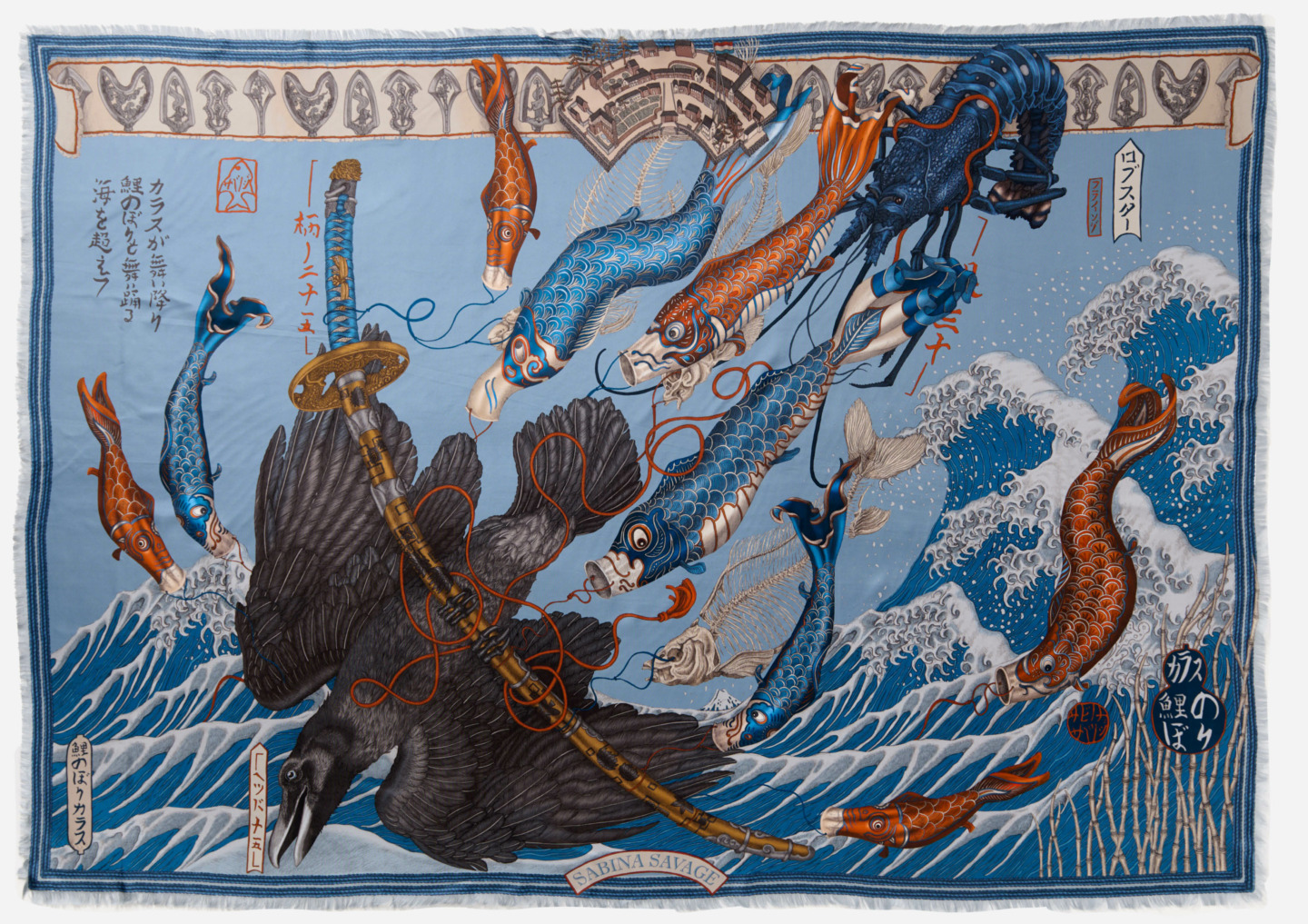 “As the sun rises, the imposing black karasu (jungle crow) soars above the city. Attracted to shiny things, he finds intricate arrowheads amongst the Tango No Sekku decorations and steals a gleaming samurai sword. His shadowy presence spooks the locals, who then spook him in turn, and losing balance, he becomes caught in the koinobori carp streamers. Panicking now, the imposing corvid heads towards the harbour, unwittingly collecting fish bones and a lobster as he glides.”