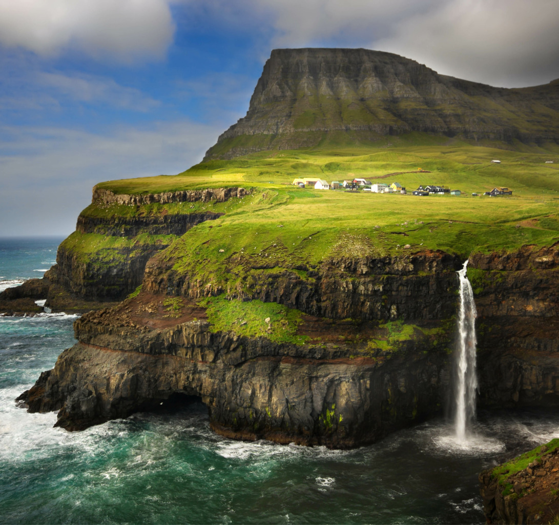 The Múlafossur Waterfall falls directly into the North Atlantic from Gásadalur village.