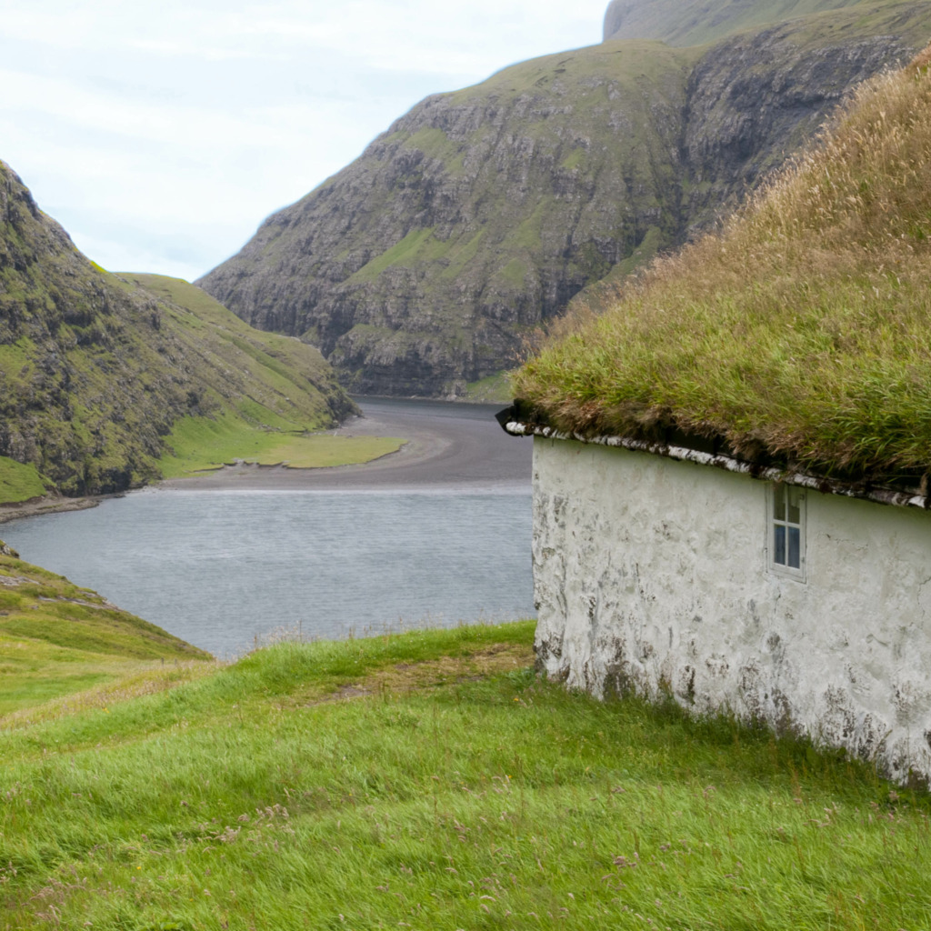 Traditional stone and wooden houses with grass roofs in the Faroes.