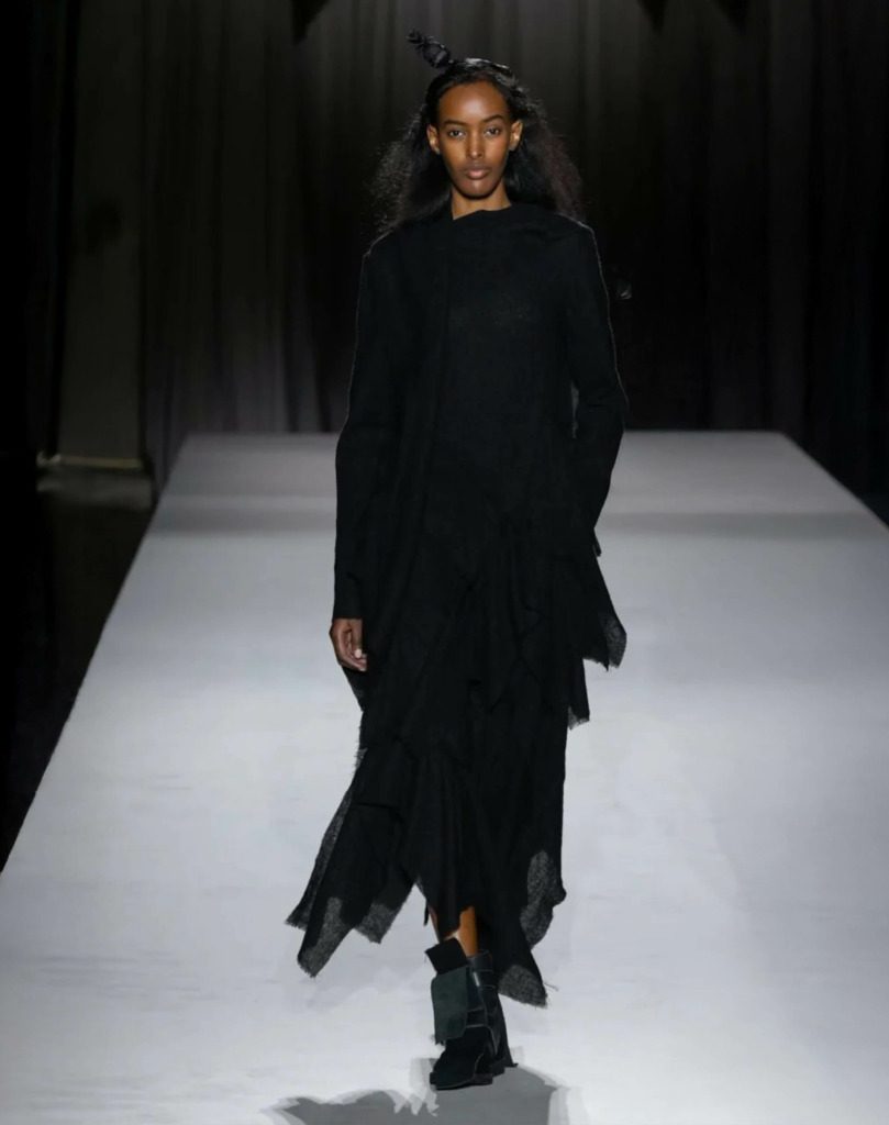 For Yohji, black is universal–a unifying canvas that works across genders, ages, body types. He often says that it is “modest and arrogant at the same time”–a tone that refuses decoration, but commands attention. By harnessing the absence of color, Yohji strips away distraction, allowing the cut, movement and idea of the garment to come forward.