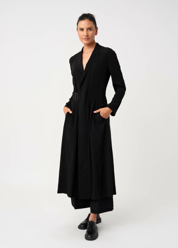 Mona wears the Crêpe de Chine Duster Trench Coat in Black.