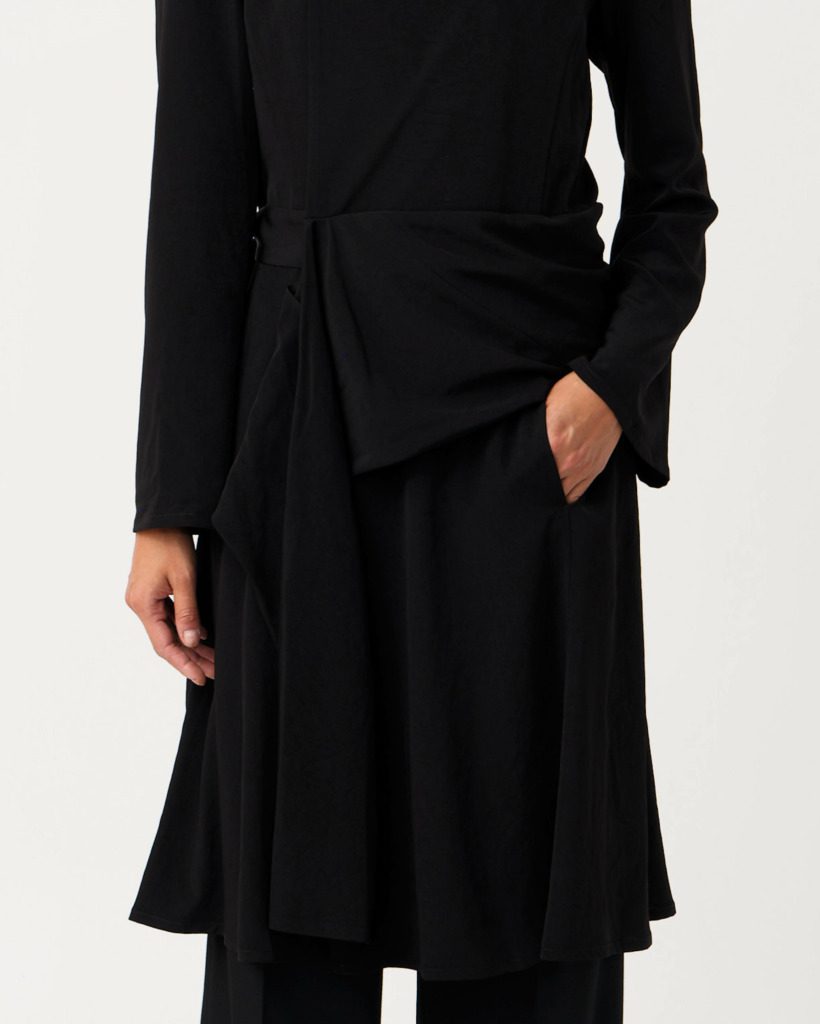 Mona wears Crêpe de Chine Wrap Coat in Black.