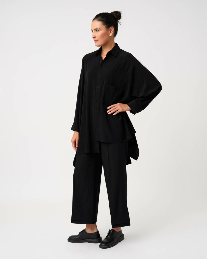 Mona wears the Crêpe de Chine Tiered Hemlnie Button-Down Top in Black.