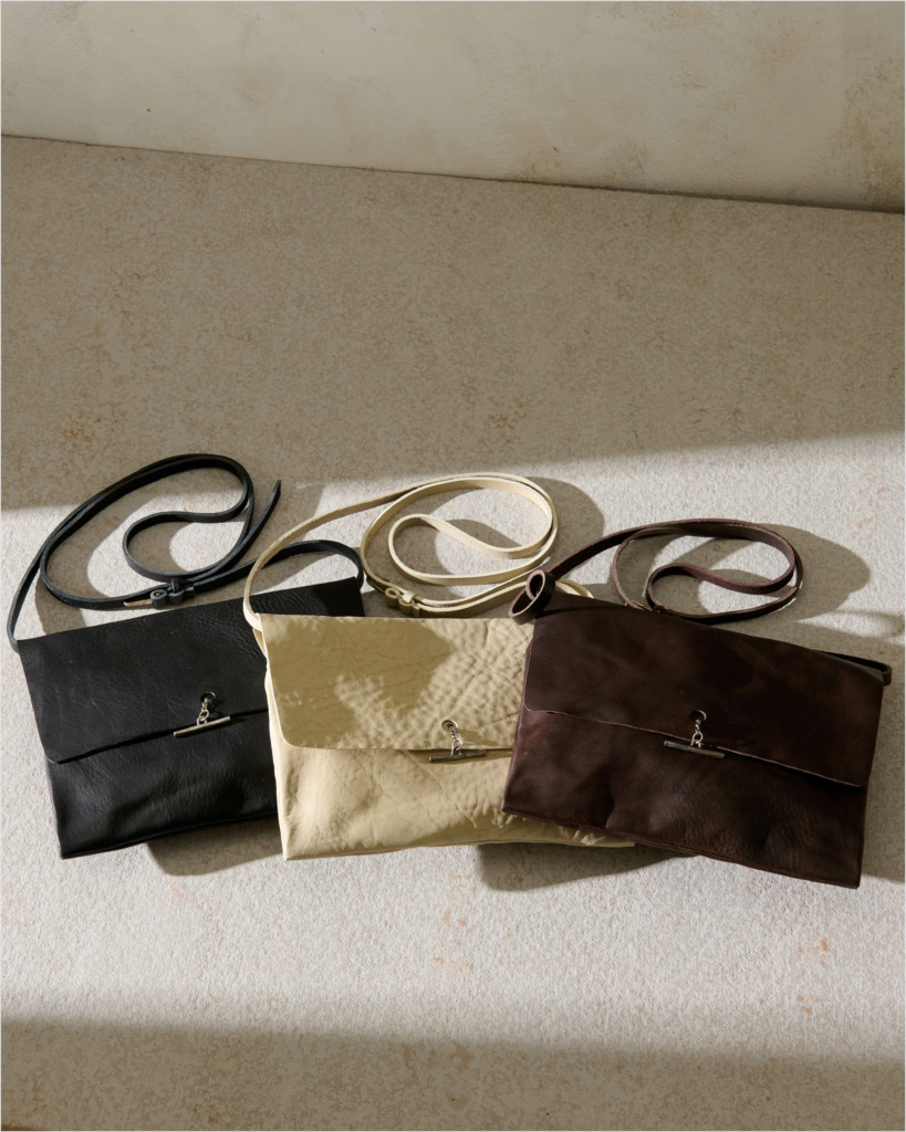 His leather of choice is an incredibly supple lambskin, an ideal canvas for the deep monochrome dyes that inform Daniele’s palette. In addition to being lightweight for handbags, the handfeel is notably soft—akin to leather accessories that have been worn again and again, becoming more pliant with time.