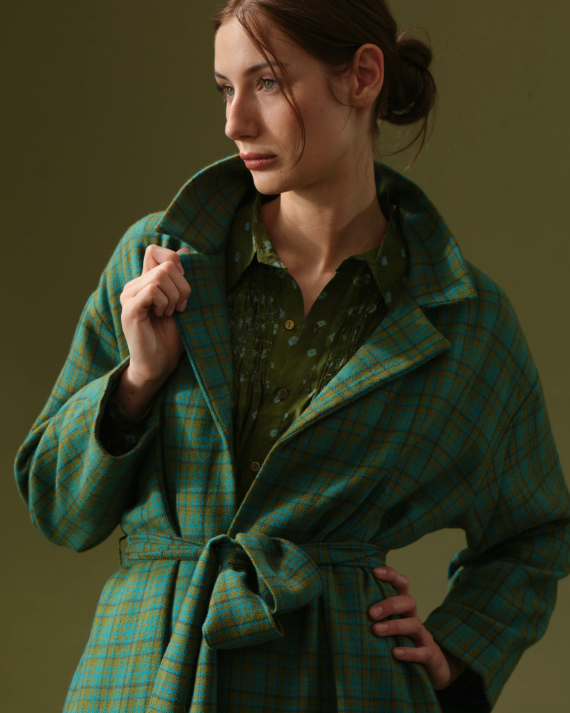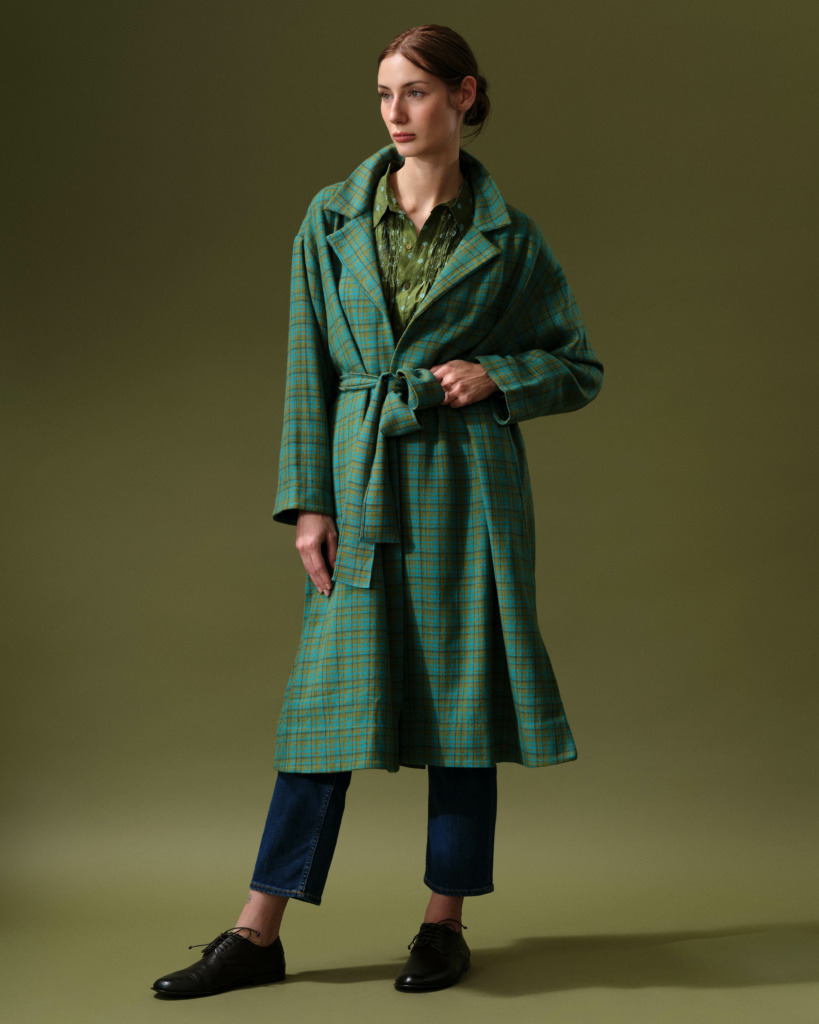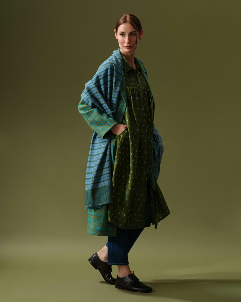 Cloud-shaped embroidery and delicately pintucked pleats decorate the dresses and tunics, while the shirting and coats are kept simple. The palette centers around the soft greens and blues achieved through multiple layers of indigo dye, lacquered one over the other like watercolor.