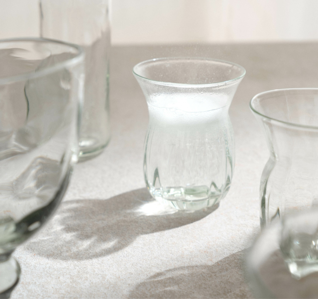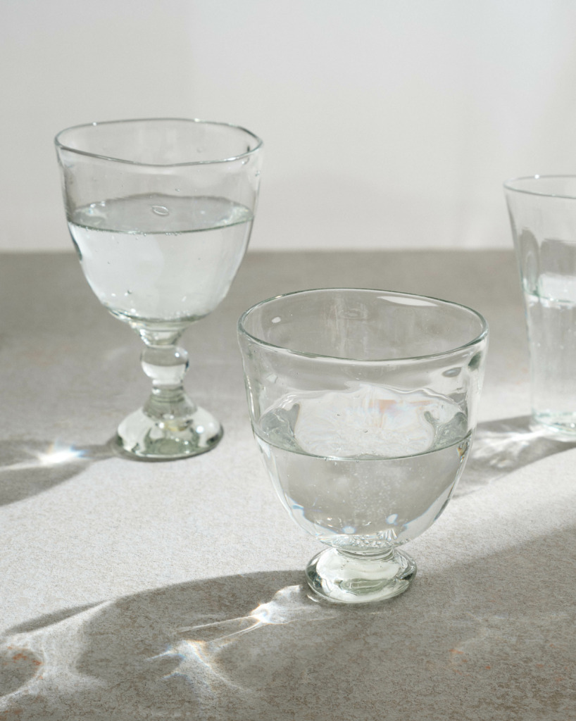 Like the bodies of water that inspire her work, Miyo’s glassware is liquid in the hand. As if she has captured the surface of a crystalline pond, each glass glimmers and shifts, changing character and presence based on its surroundings.