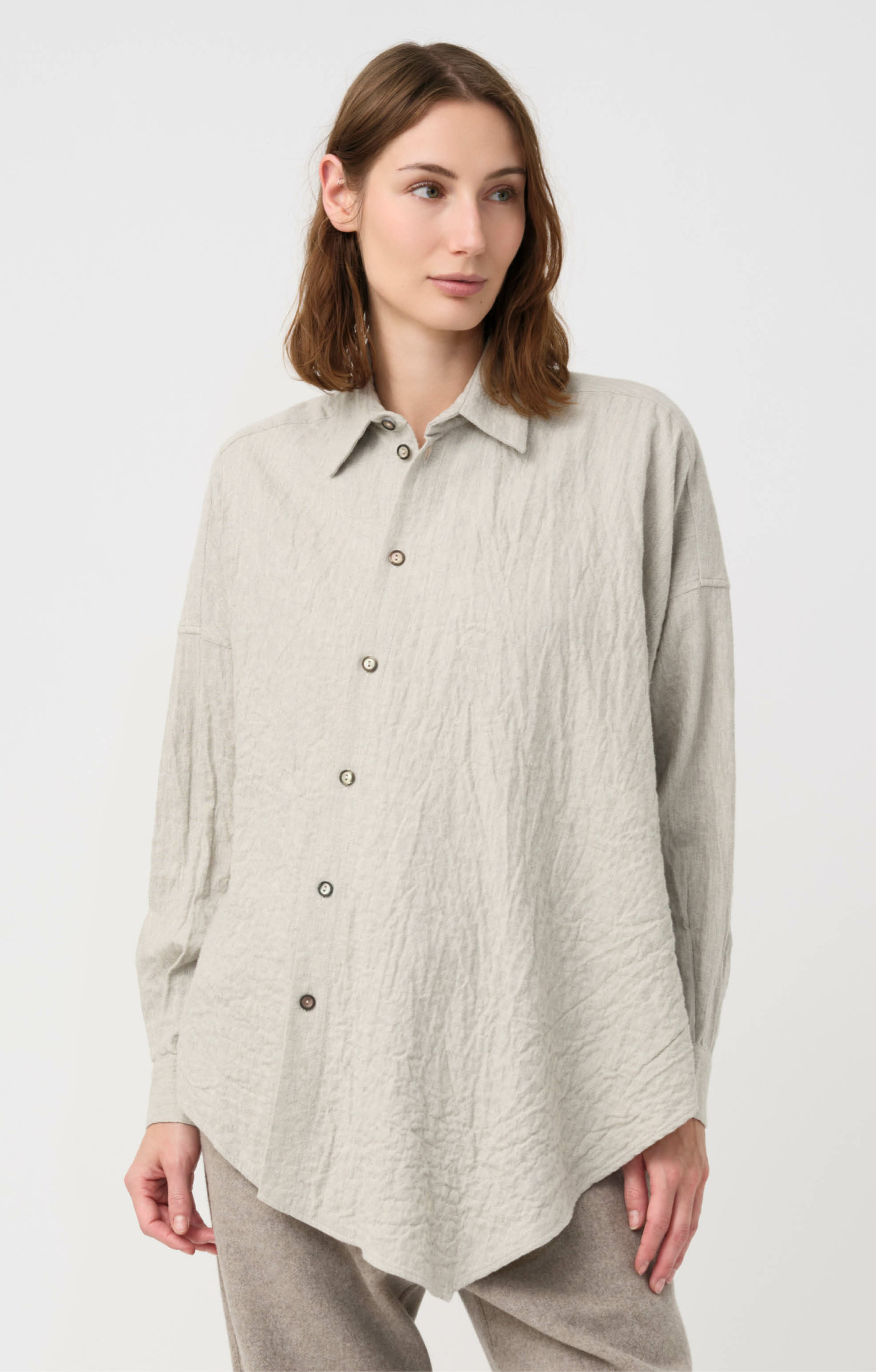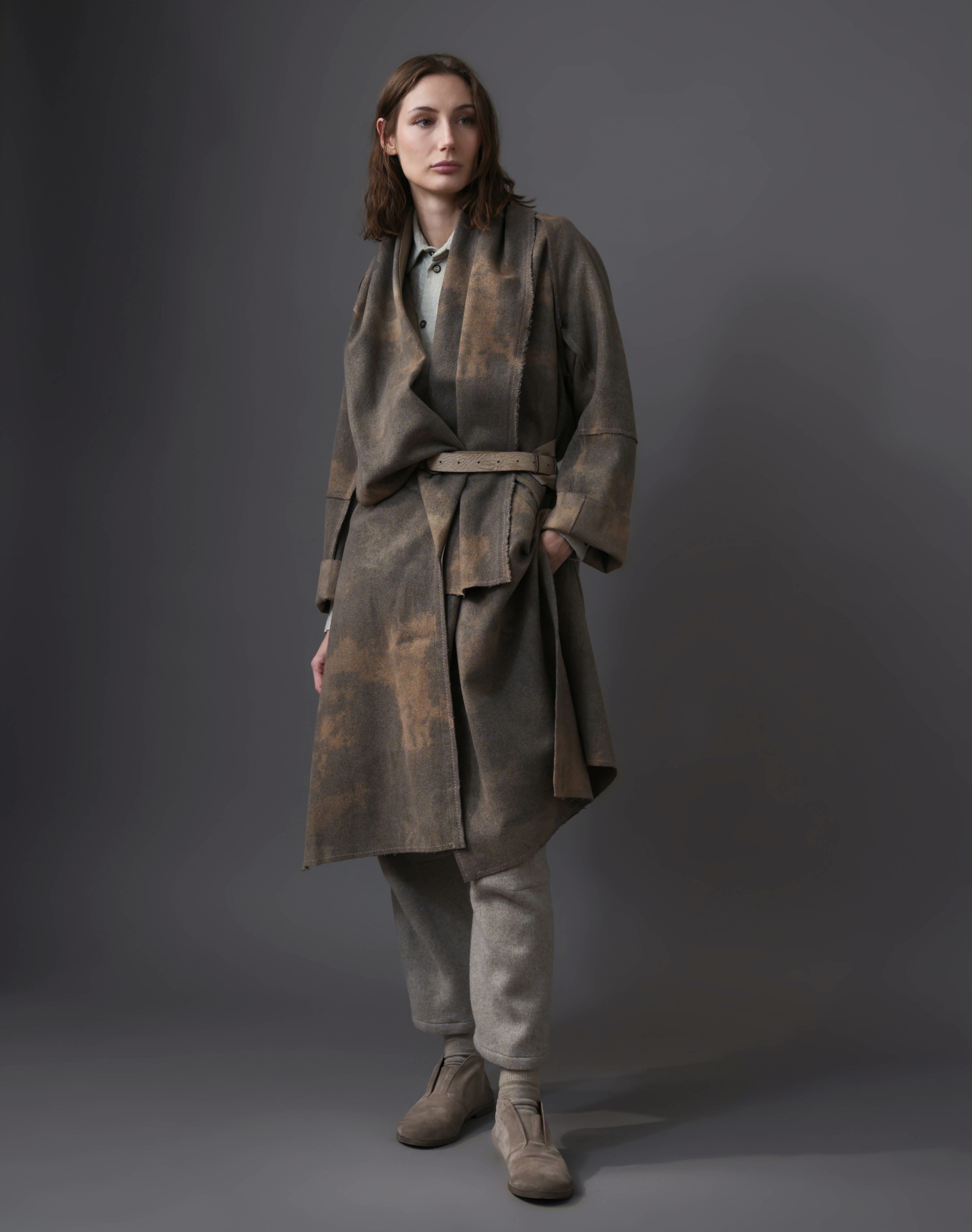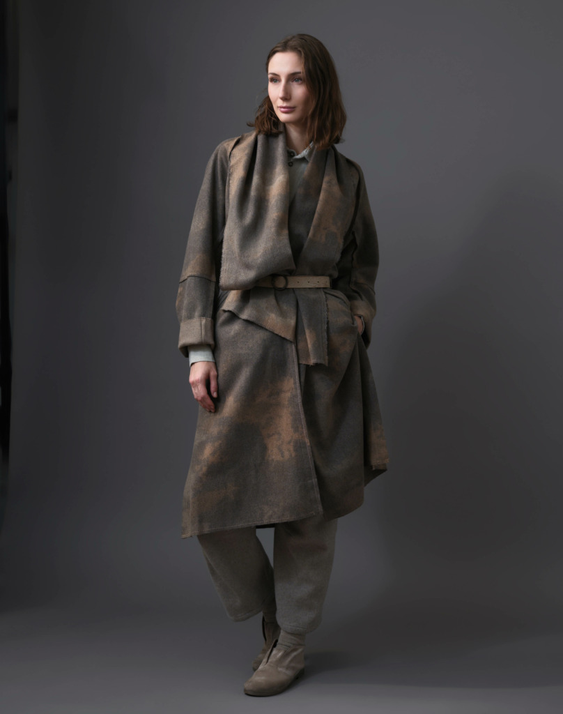 Sita wearing the Thermal Raw-Edged Wrap Coat in Desert Sand & Ash Grey