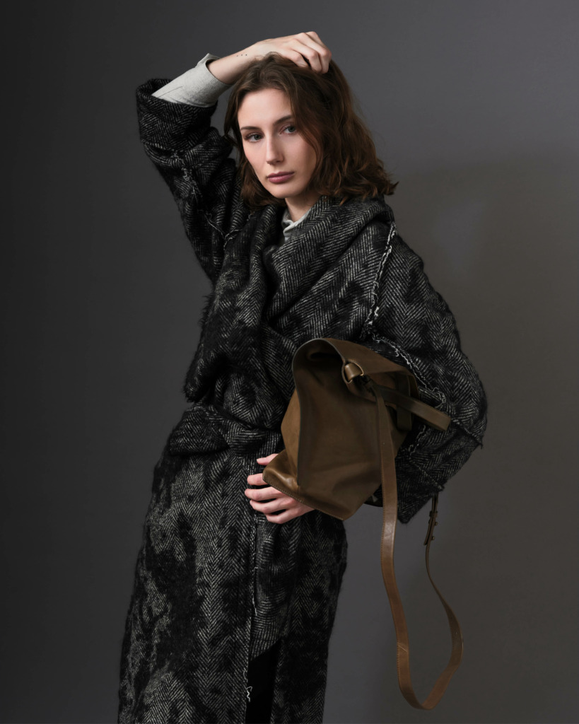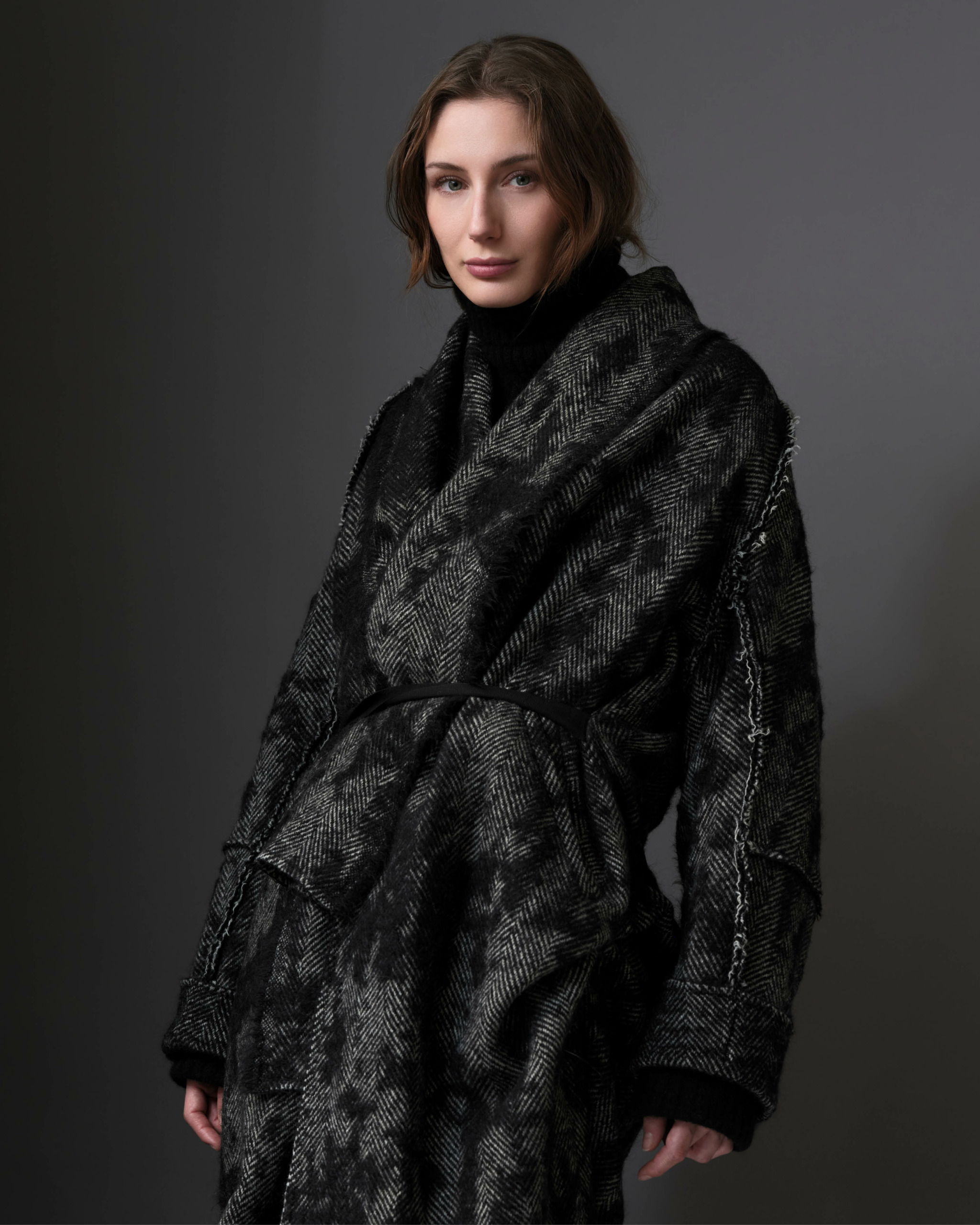 Sita wearing the Thermal Raw-Edged Wrap Coat in Monochromatic Black & White