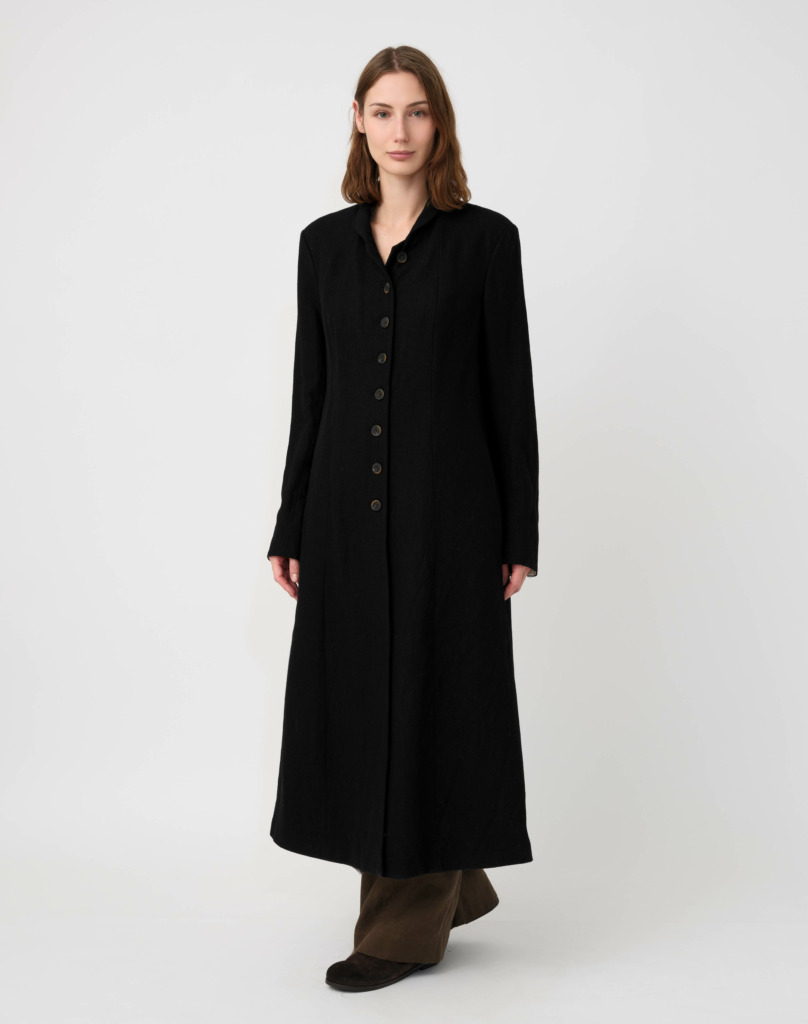 For Fall/Winter 2025, designer Koeun Park presents a wardrobe built on the power of reduction. Each silhouette for her label, Forme d’Expression, is built up in layers before being pared back. Familiar elements of tailoring—lapels, clean seams, fluid drape—are refined until they feel effortless. Her palette remains anchored in the deep neutral tones we loved for spring, with monochromes and muted earth tones that lend strength without the need to shout. The result is a collection that trusts silence—honoring the absence of excess as much as the presence of design.