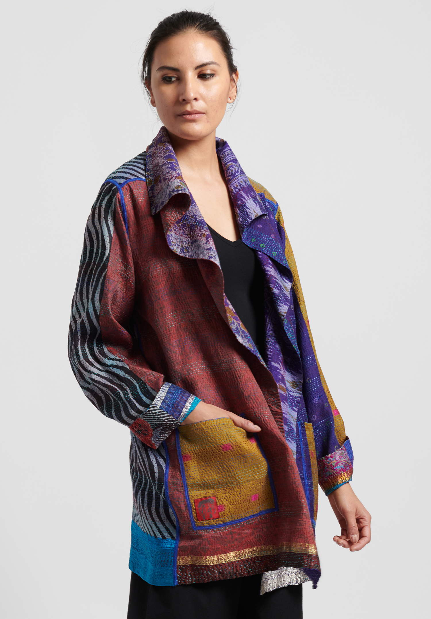 Mieko Mintz synthesizes rich textile traditions with modern aesthetics. Her line of one-of-a-kind Kantha jackets has since become her signature, fusing traditional Indian handcraft with sophisticated and contemporary Japanese designs. This delivery showcases subtle larger patterns interwoven with sophisticated smaller prints. Colors are equally unusual and dynamic, proving that Mieko and her cooperative of artisans have a rich and informed aesthetic in their creation of one-of-a-kind pieces.