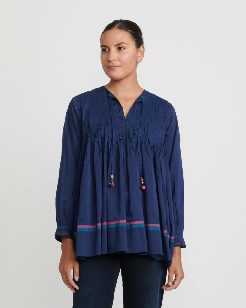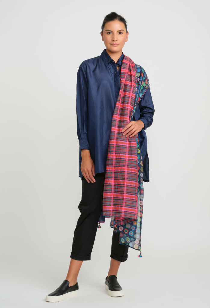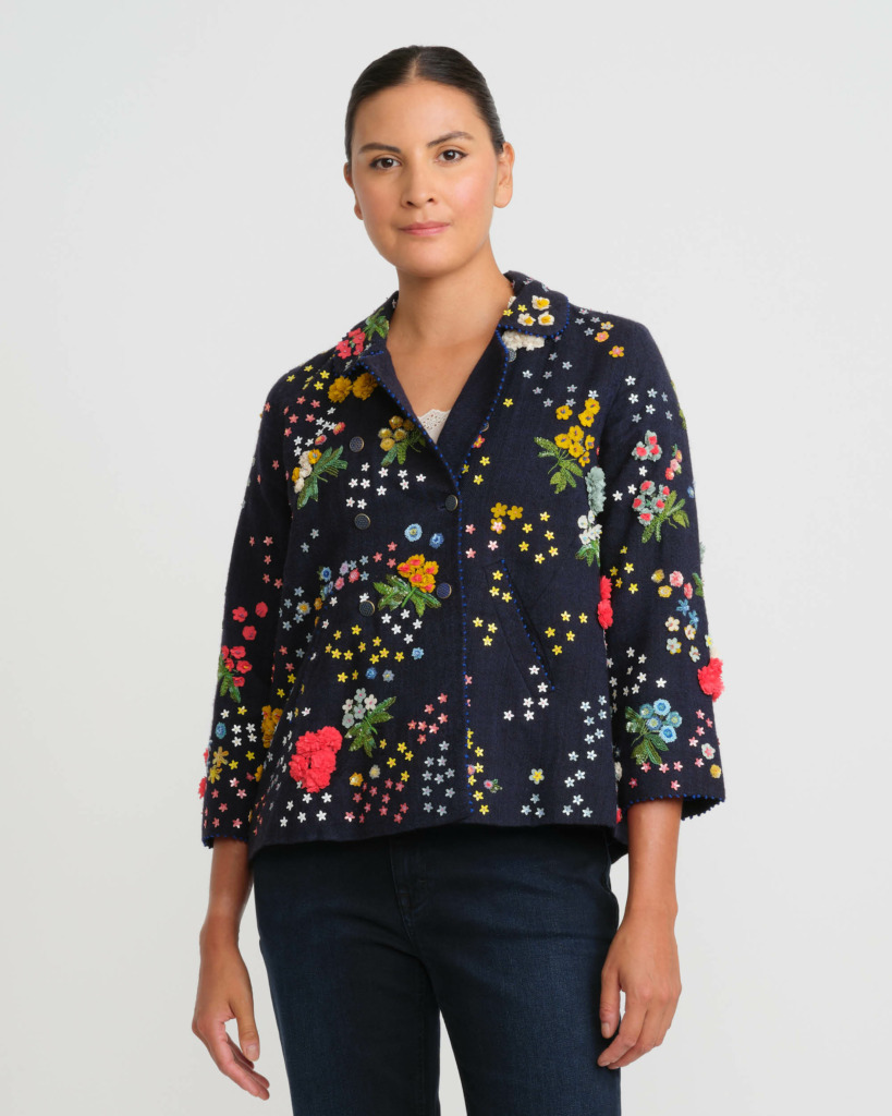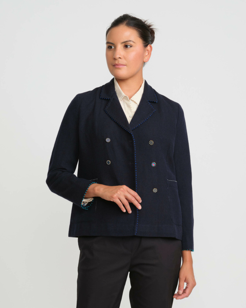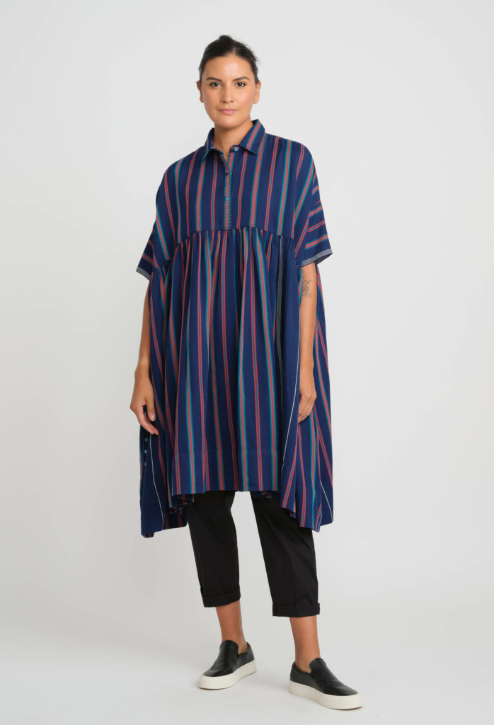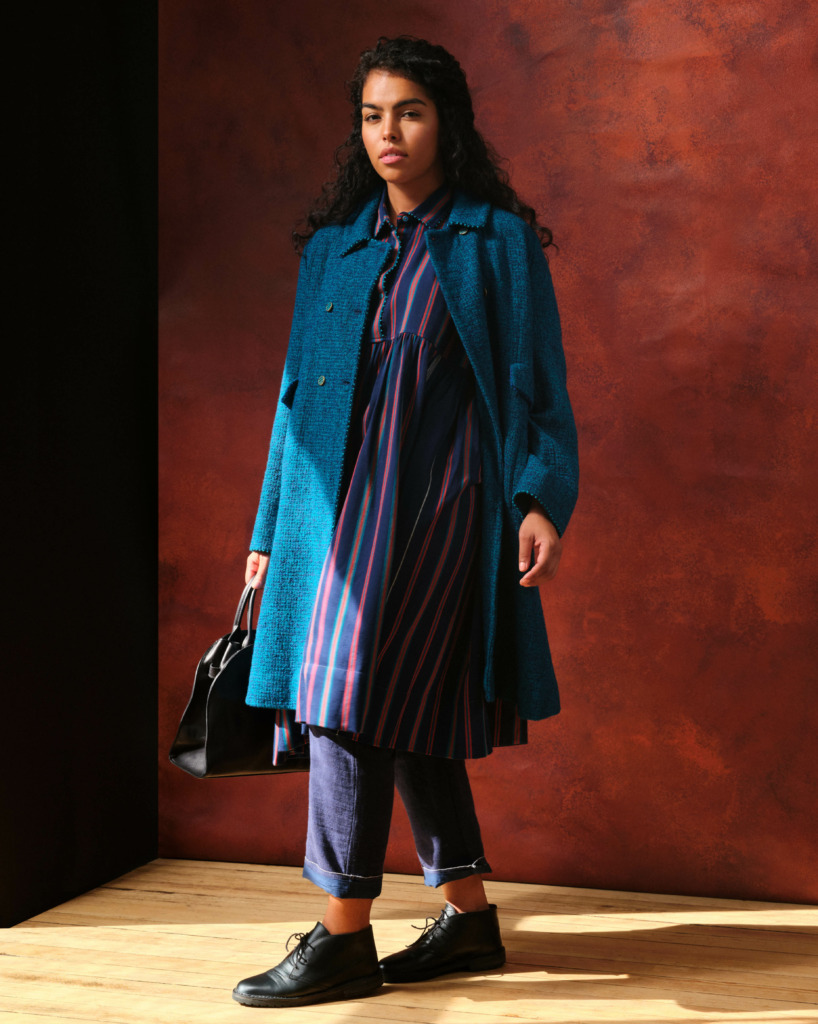 Aneeth’s design intuition feels deeply nostalgic. Sentiment echoes within the garments, notable in the precious, hand-stamped buttons, big lapels and lacy embroidery across a haberdashery of vintage plaids and stripes. Teal and turquoise dominate the palette, with pops of cherry red for contrast.