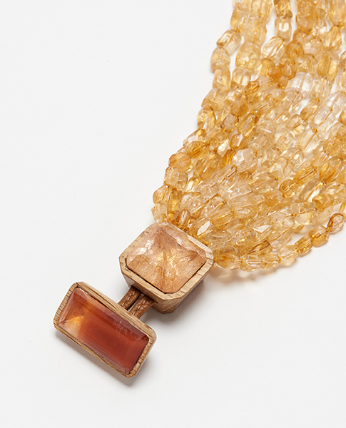 The play of light and texture between the intersecting filaments of the rutilated quartz, the creaminess of the carnelian and the glimmer of the citrine strands creates a piece that is simultaneously unexpected and extraordinary.