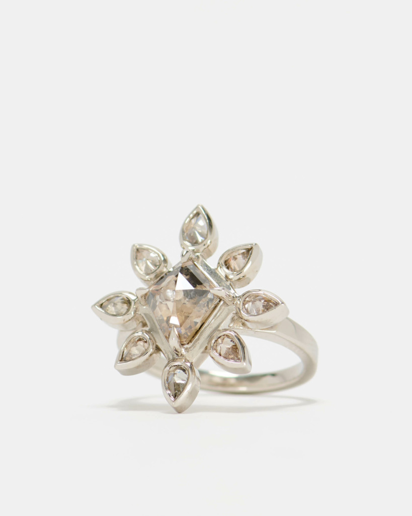 DIAMOND DUST: A stand-out for both shape and character, Lauren Wolf’s Salt & Pepper Snowflake ring shines among a collection of already exceptional diamonds. Part of our first capsule delivery from the Bay Area designer, this piece features a brilliant, kite-cut varietal set in platinum, flanked by a halo of champagne teardrops.