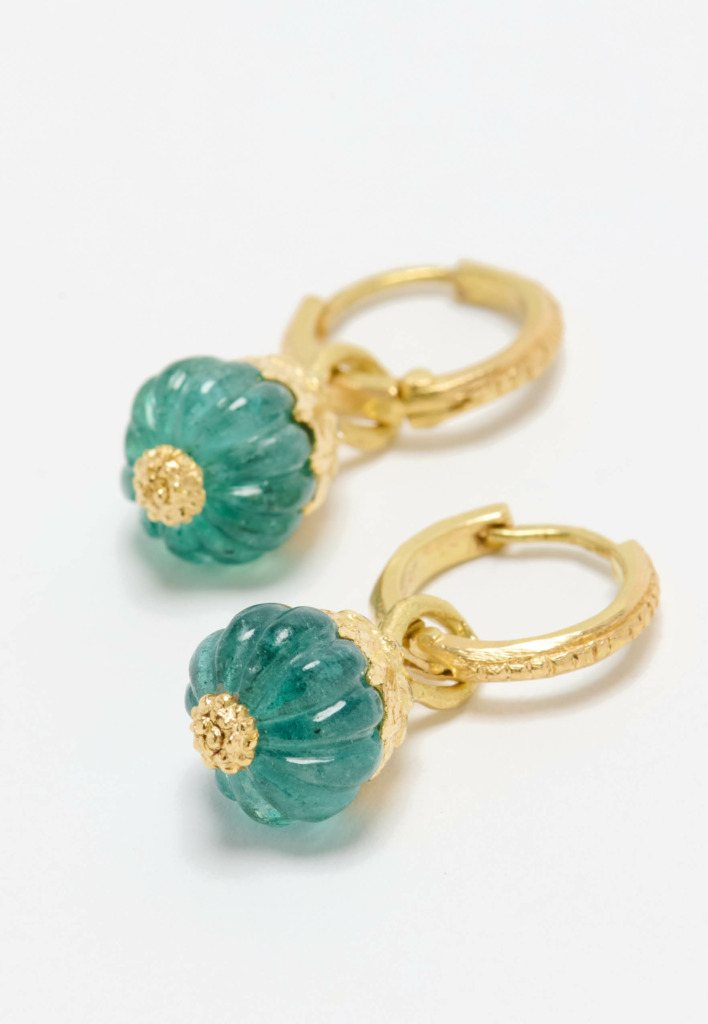 MORNING GLORIES: A favorite in-store, Greig Porter’s collection is most coveted for its devotion to color. In this single-strand necklace, dozens of emerald beads slowly graduate forward, punctuated by an array of 18K gold beads. An echo of royal collars of antiquity, this style emphasizes elegance.