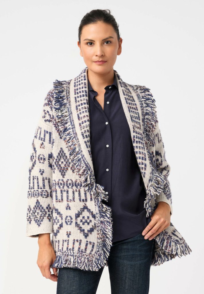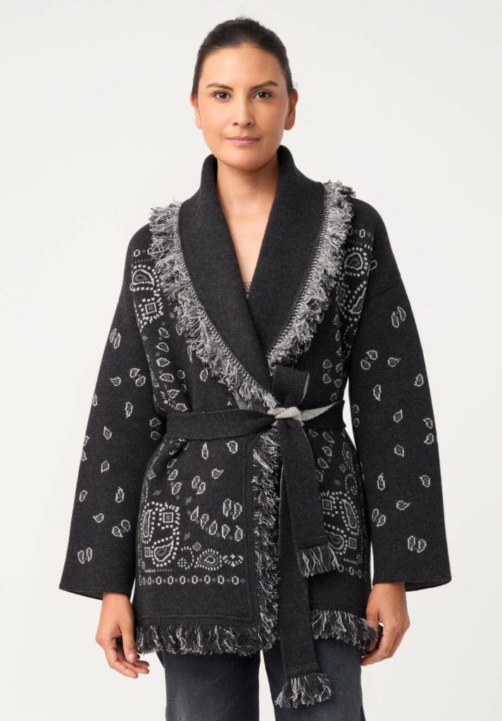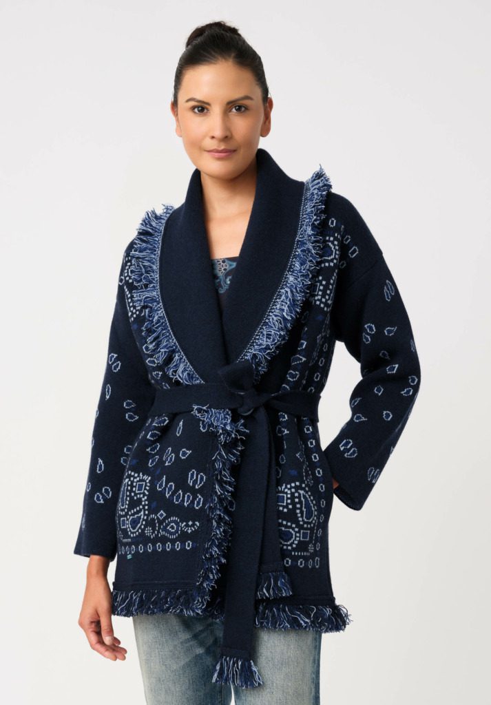 Another new-to us label is the stylings of Alanui—a small, Milan-based studio with a penchant for meticulously knit cashmere cardigans. Influenced in equal parts by California surf culture, Native American design and the annals of high fashion, these pieces are distinctive, decorative and very fun to wear.