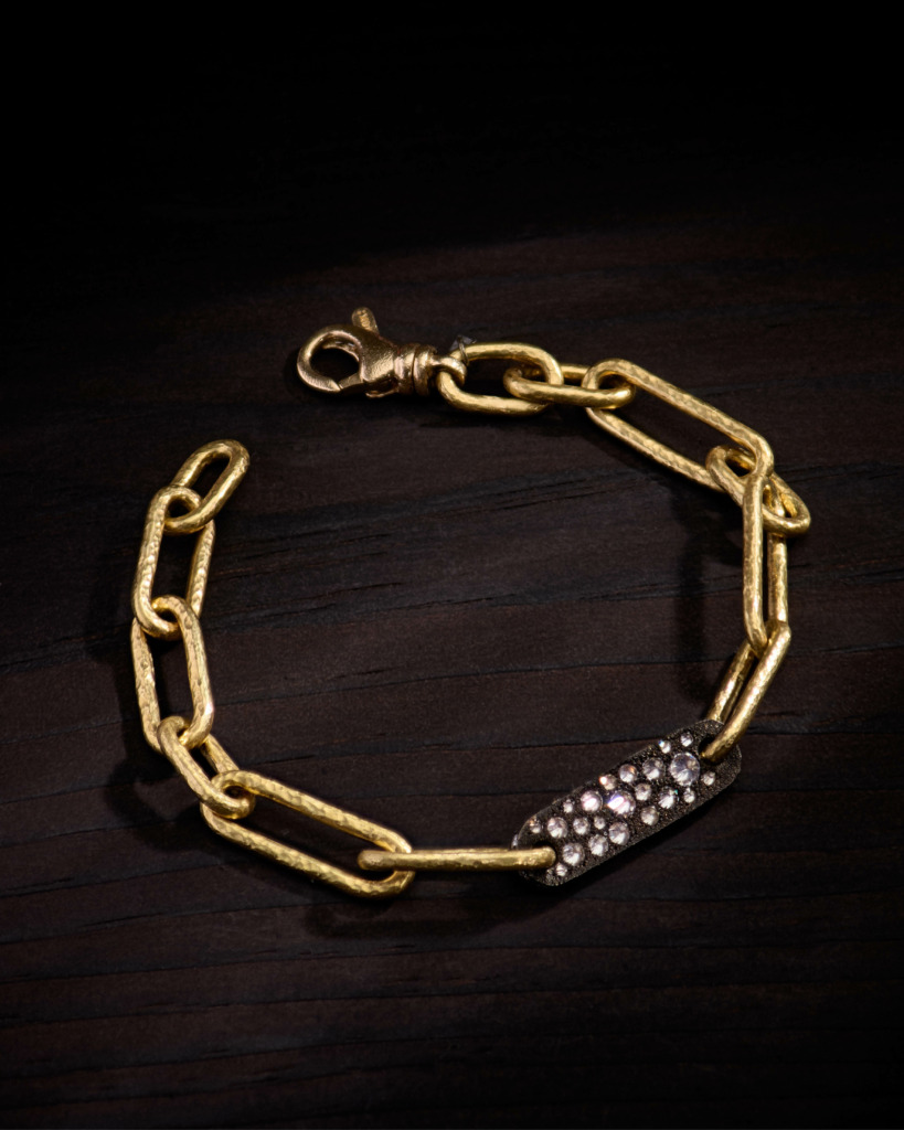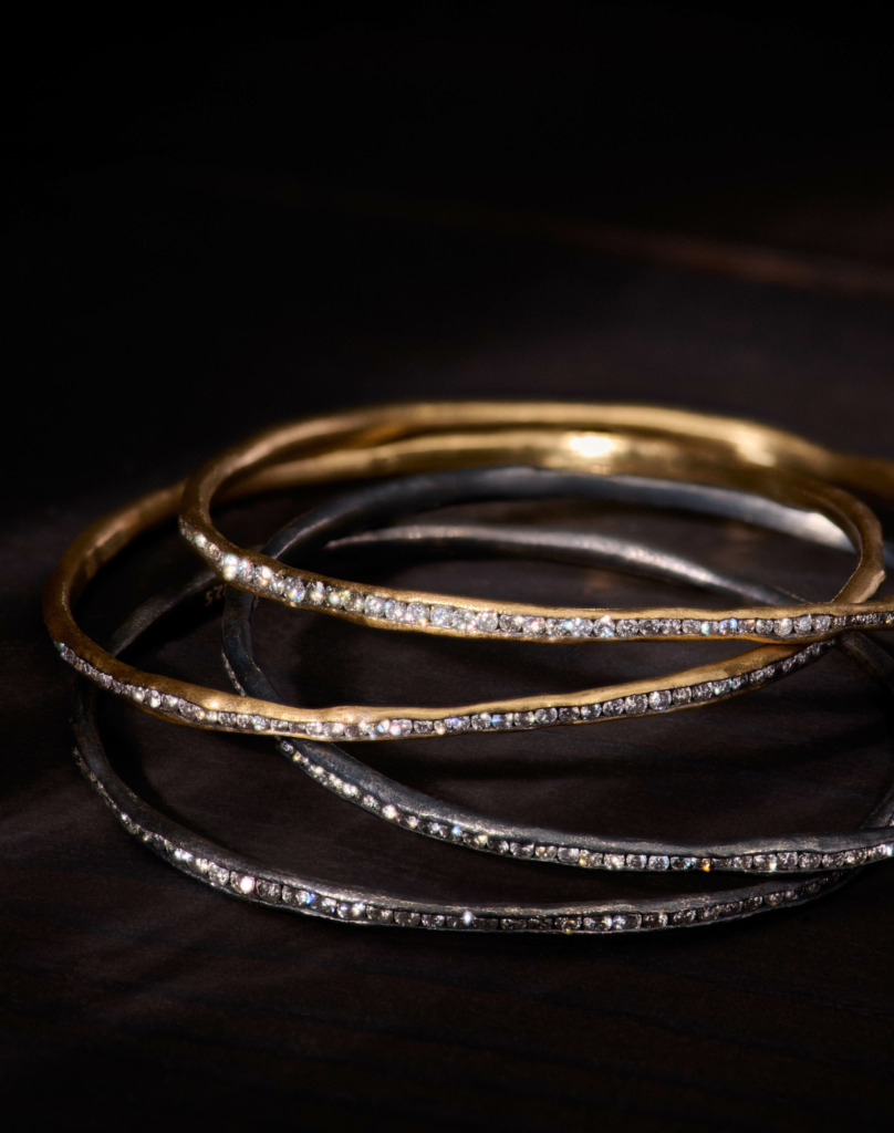 Todd and Debra are infamous for their willingness to eschew the traditional and experiment with their settings. From their bench, we see a magnitude of presentations: spiky, reverse-set stones, undulating channel settings and hammered interlocking links among their favorite motifs… all of which achieve cohesion even in the most unusual shapes.