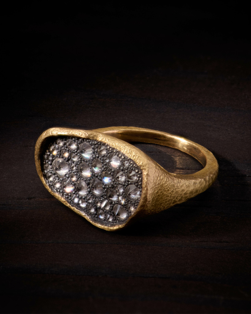 In one of their most striking cocktail rings, ten marquise diamonds are nestled against an oxidized silver. The distinctive ovaline shape of this cut is typically used in the singular to give a piece of jewelry a “big” diamond feel. However, Todd and Debra set a cluster of smaller stones to maximize the glitter factor.
