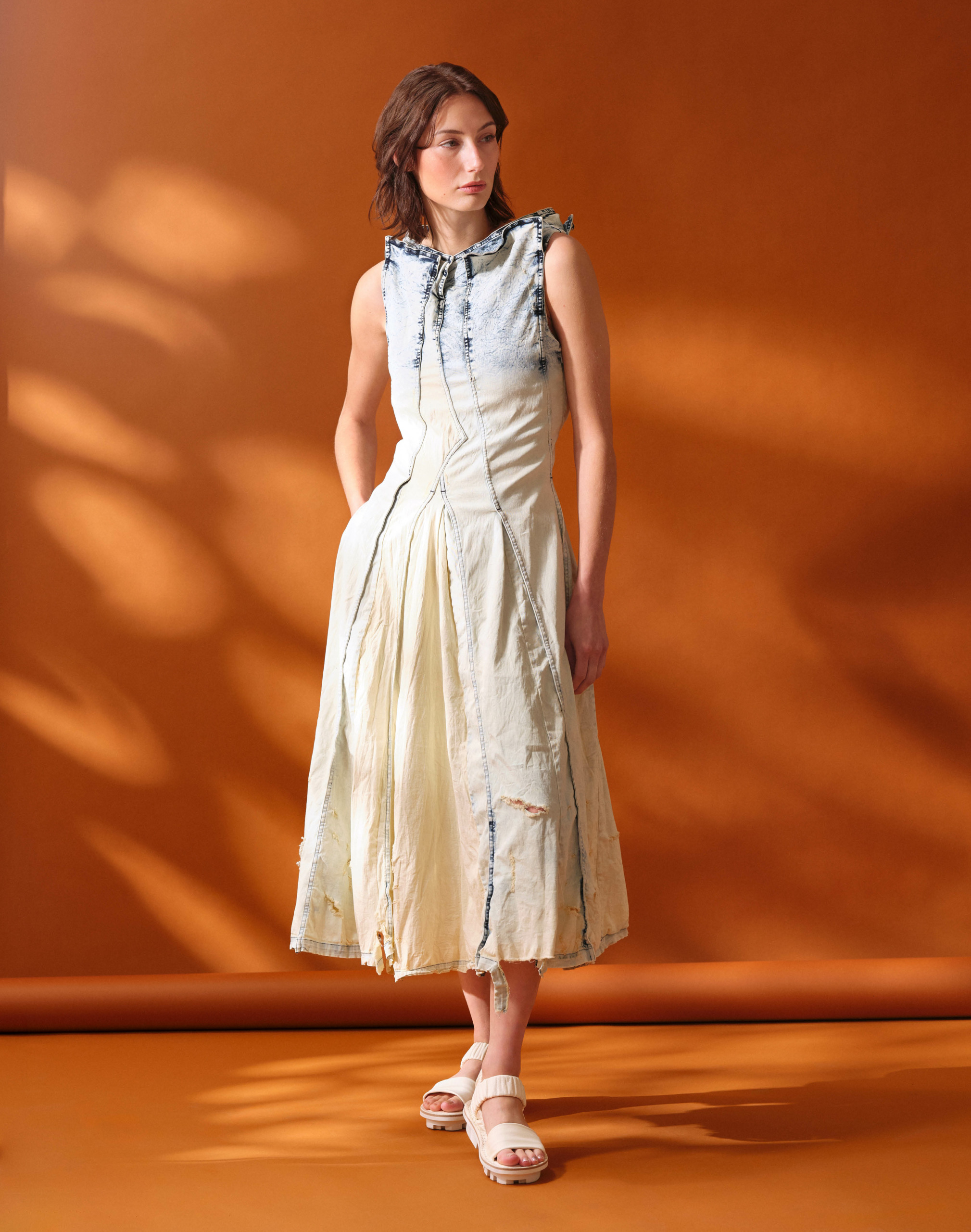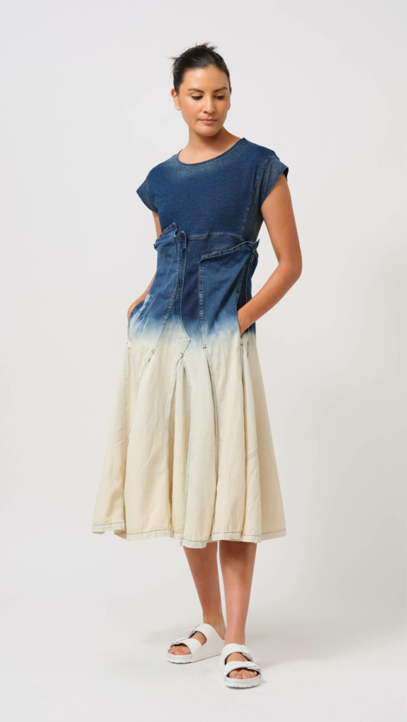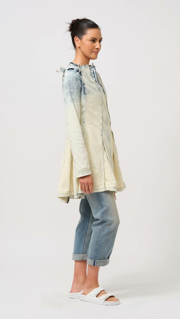 Twenty years later, Carsten pays homage to these origins with denim that could be straight off Kojima’s Jean Street. As with all DIP designs, each piece is assembled and then dip-dyed by Carsten and his team. This method leads not only to a unique finish, but moments of precious spontaneity, such as artful splatters across a hem. Often you will see DIP’s care tags soaked and crinkled by the same dye.