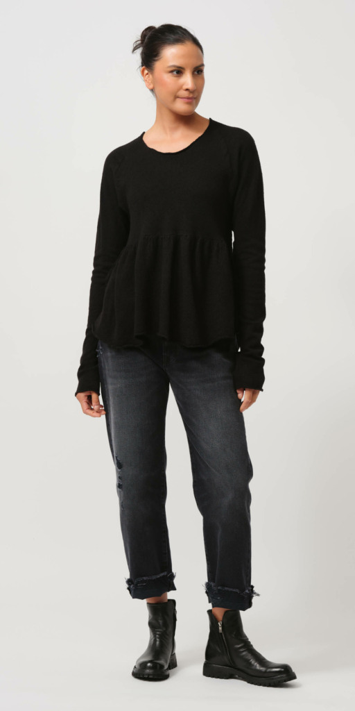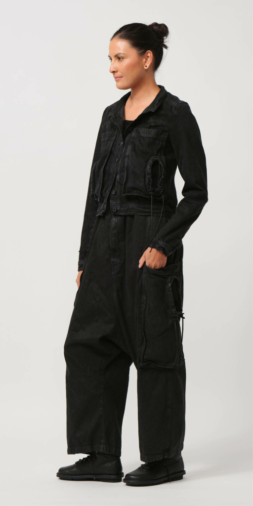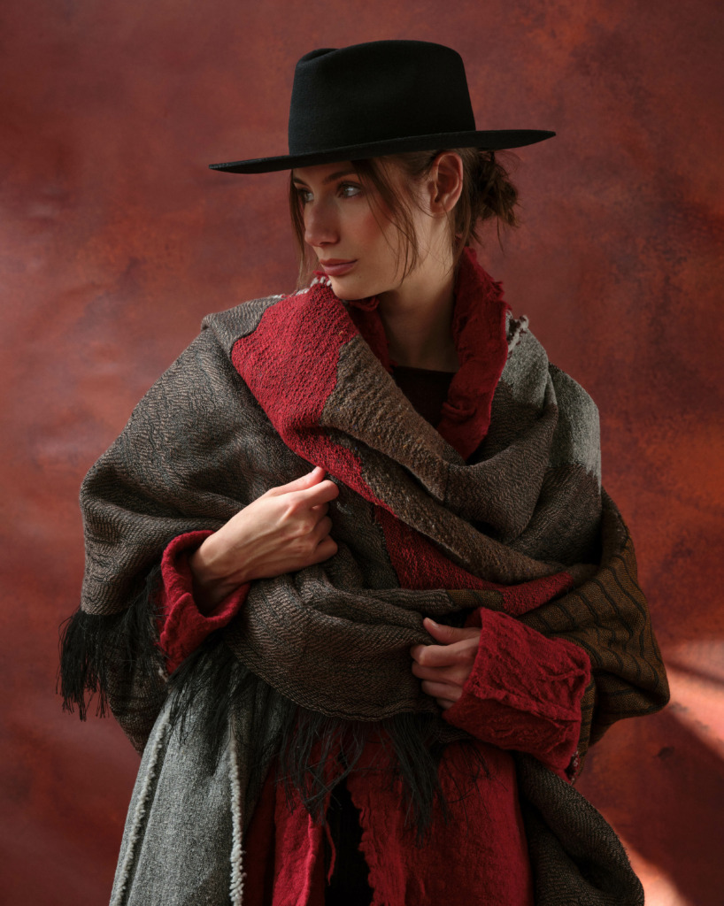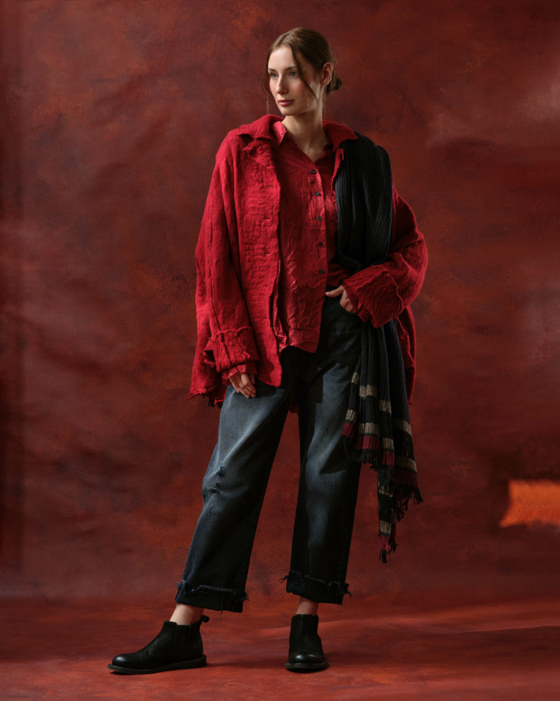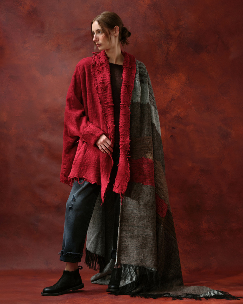 The palette is largely tonal in black, grey and white, but the addition of Sunset red provides an exhilarating punch of color. Though each piece stands well on its own, layering multiples is the best way to wear Rundholz in all its forms. With such a diverse offering of cuts and fabrics, designers Carsten and Lenka Rundholz invite us to dig our hands in and discover our own textural landscape.