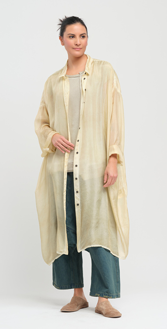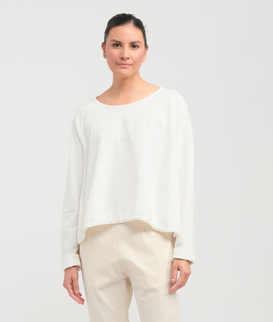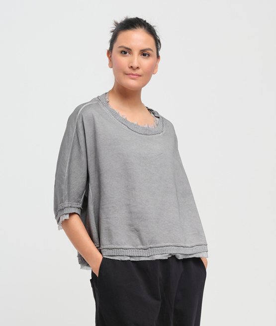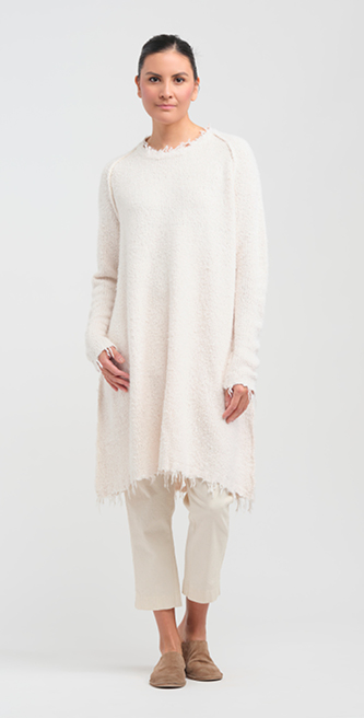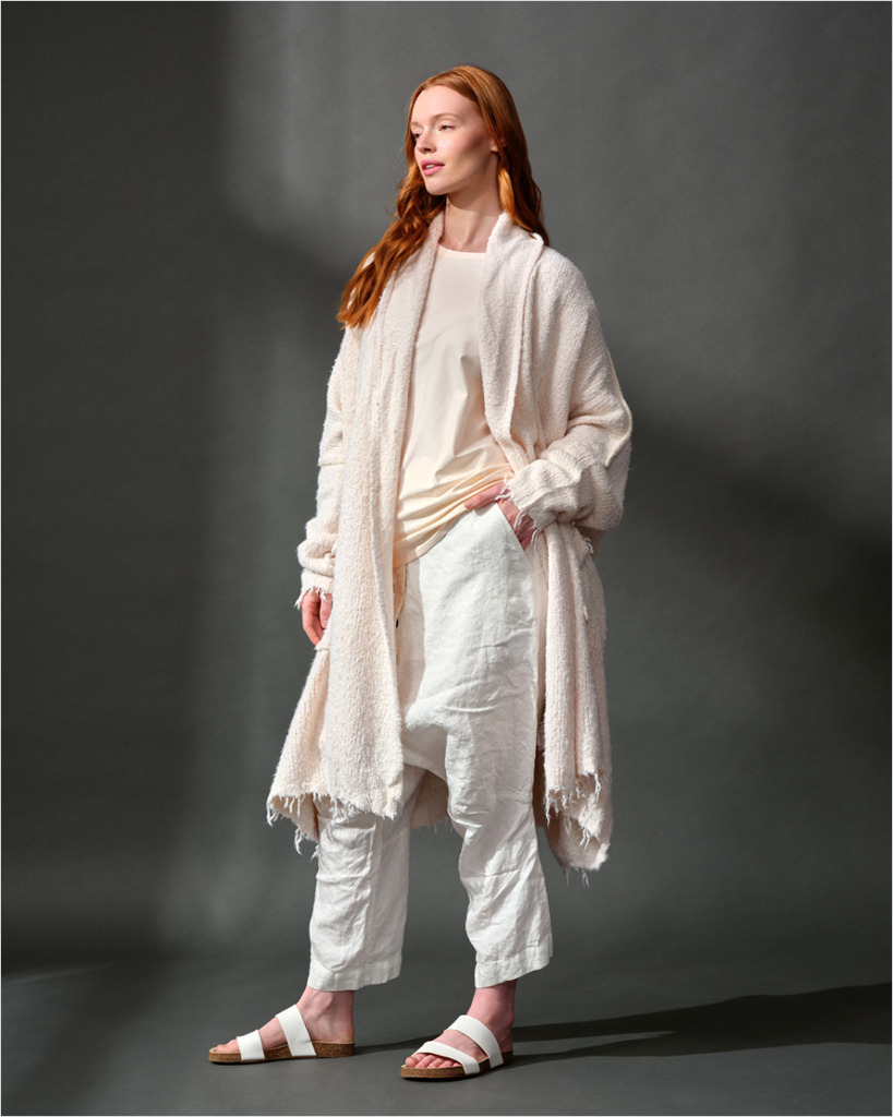 One of the most fascinating presentations in Rundholz DIP’s spring is the creamy, mid-weight knits. What reads first as a subtly shiny cotton fiber is actually a 100% raw silk yarn. In addition to being incredibly soft, breathable and moisture-wicking, raw silk is a particularly strong fabric and highly resistant to pilling. Despite the intentional distressing in the design, this is a clever choice of material to use in these pieces – ensuring each will maintain their shape and finish for decades to come.