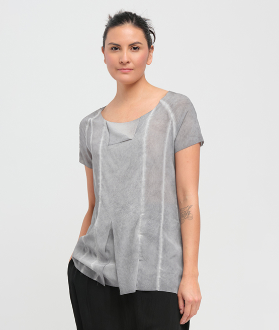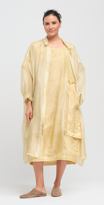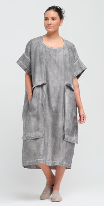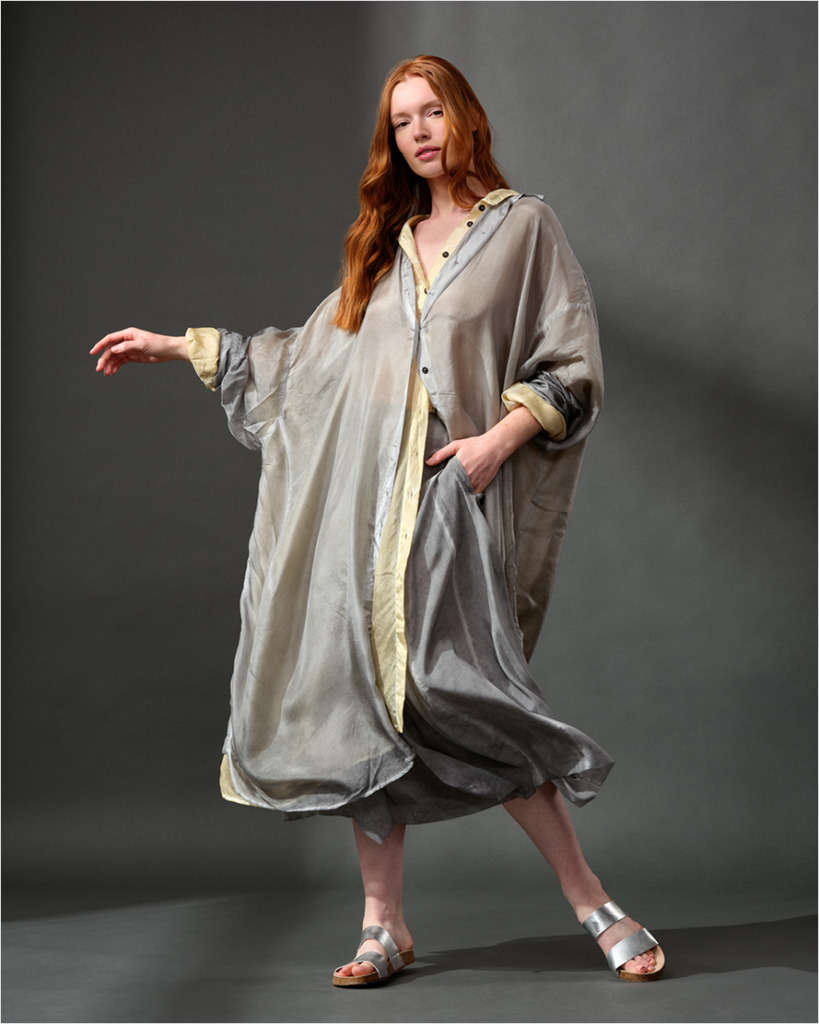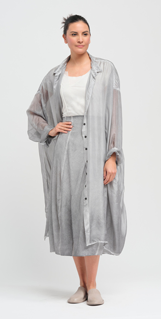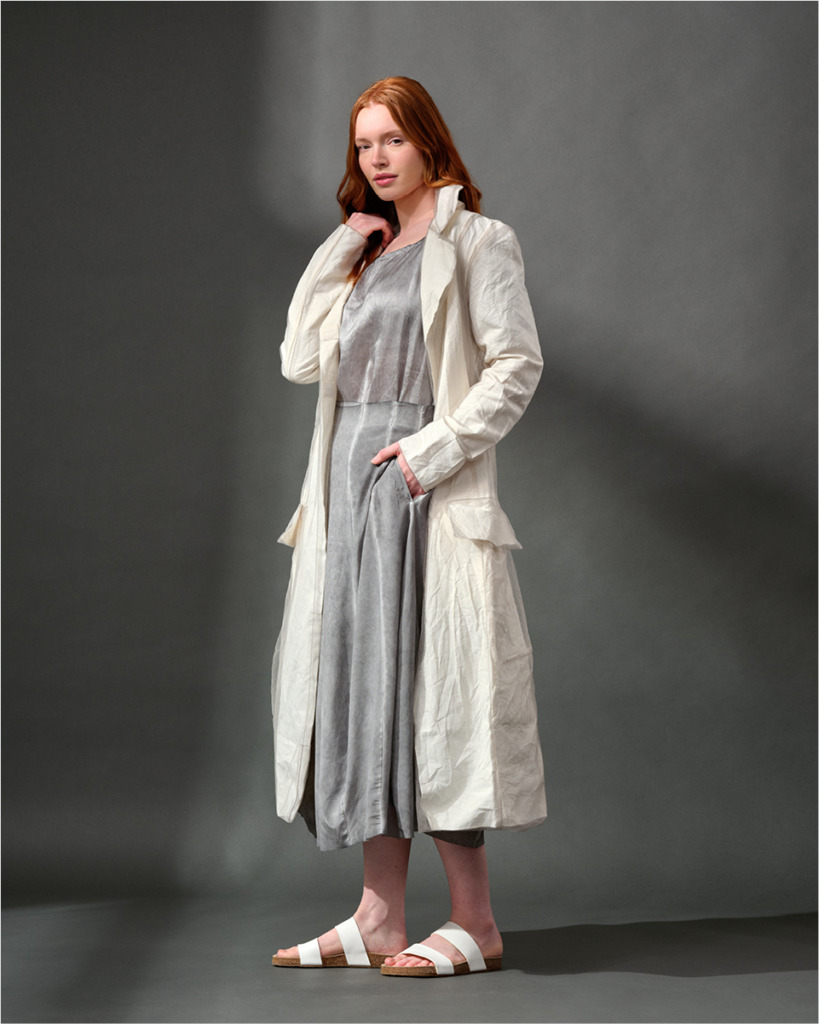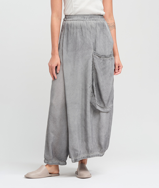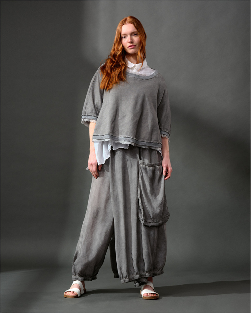 In another experimentation with silk, Carsten and Lenka have also sent along several tops, pants, skirts and dresses in stretch silk, a light-as-air material with a light sheen that conforms to the contours of the body. DIP’s special hand-dye methods work a bit of magic across this textile, modeling the grays a bit like concrete and steeping the blacks to a perfect midnight hue. The dyeing is what separates this line from Carsten and Lenka’s main Rundholz label. The entirety of Rundholz DIP, including the works in Nessel white, have been colored and finished through specialized dip-dyeing, creating a unique patina across garment’s magic.
