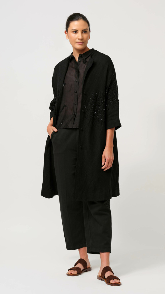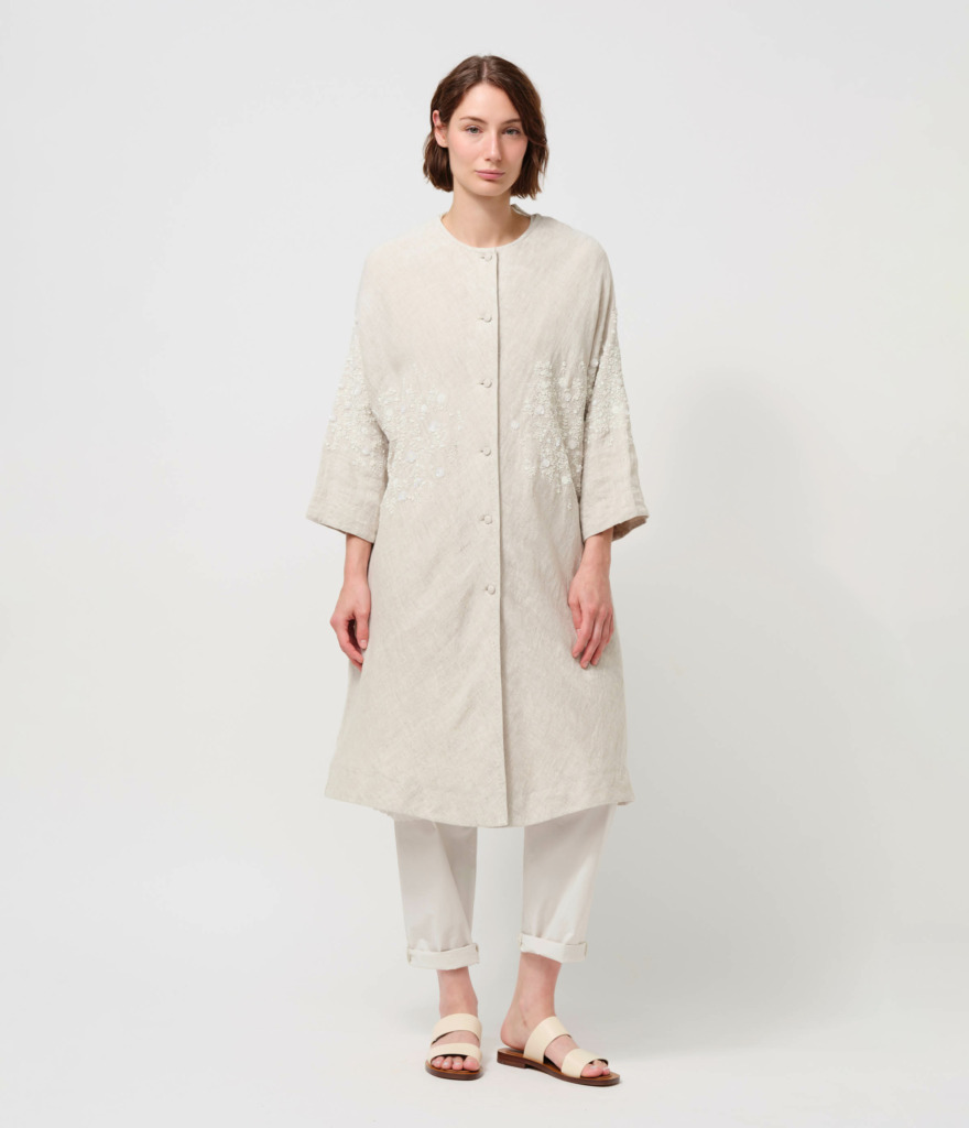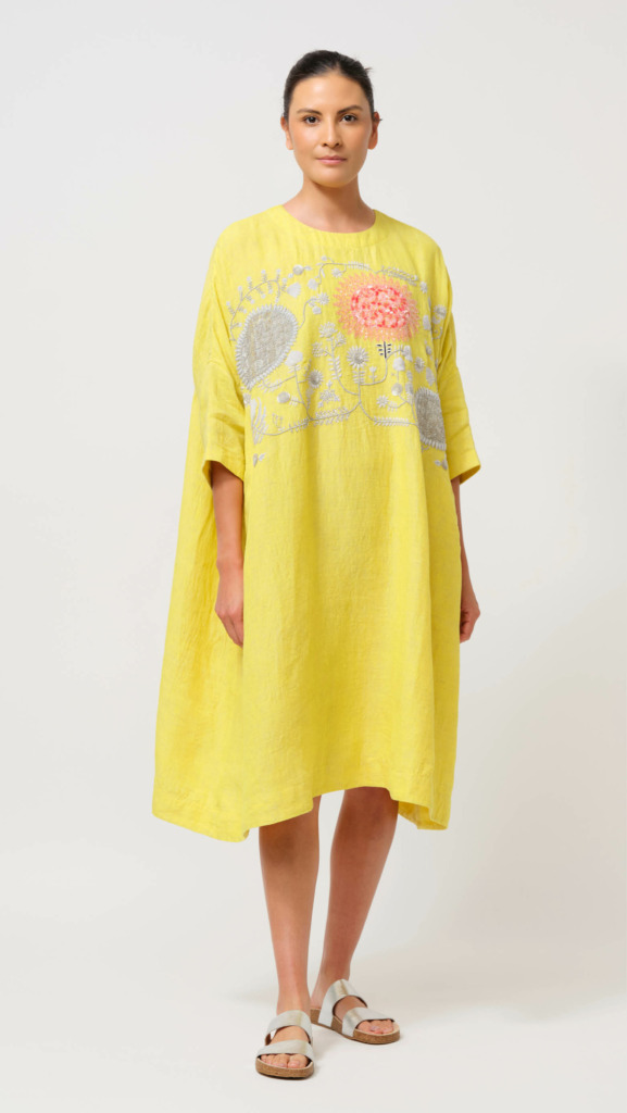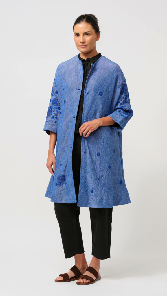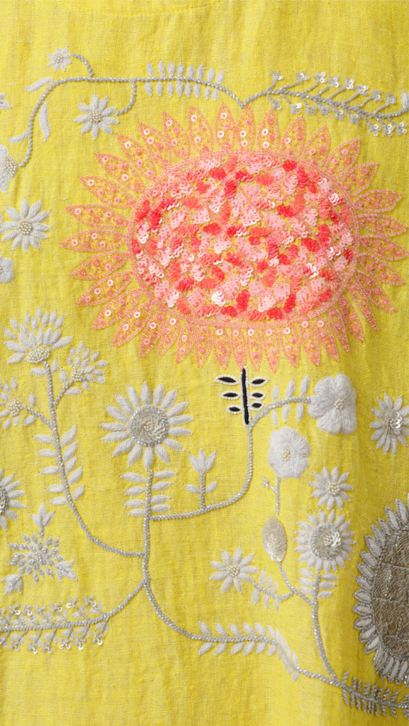 Graphic, almost primitive, blooms thread across the handwoven linen fabrics via delicate beading and tonal sequins. Often using the same color for both embroidery and fabric, the achieved textural effect is subtle, but mesmerizing. Like taking in Van Gogh’s Sunflowers, one glance is not enough—it takes several moments of longing to fully appreciate the depth and complexity of the maker’s hand.