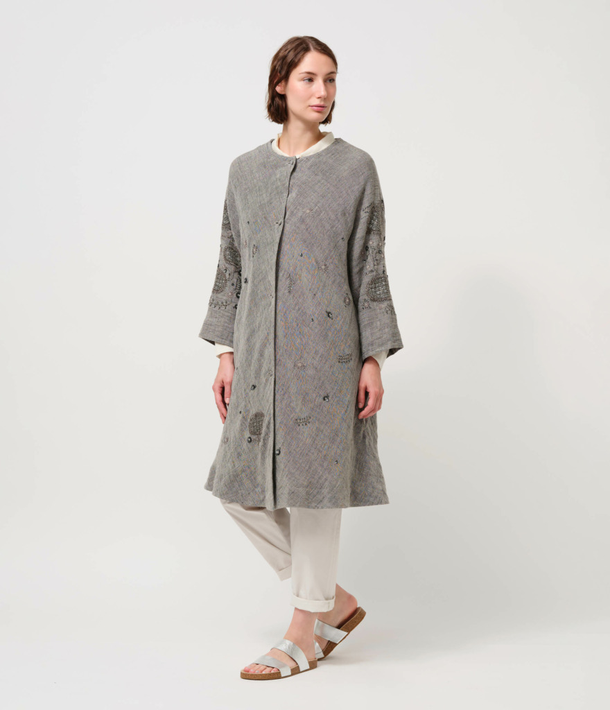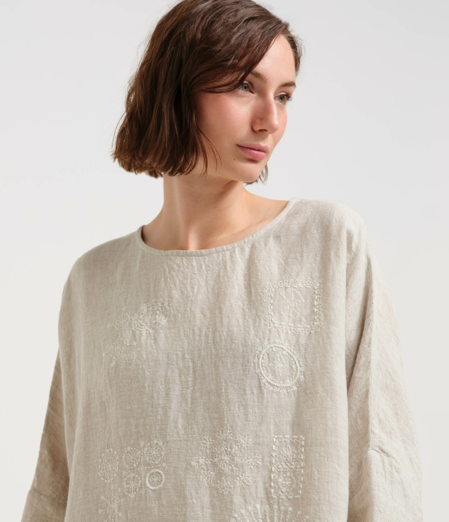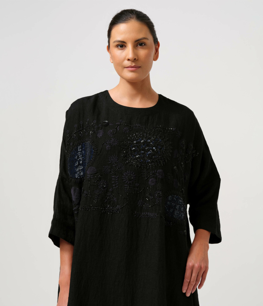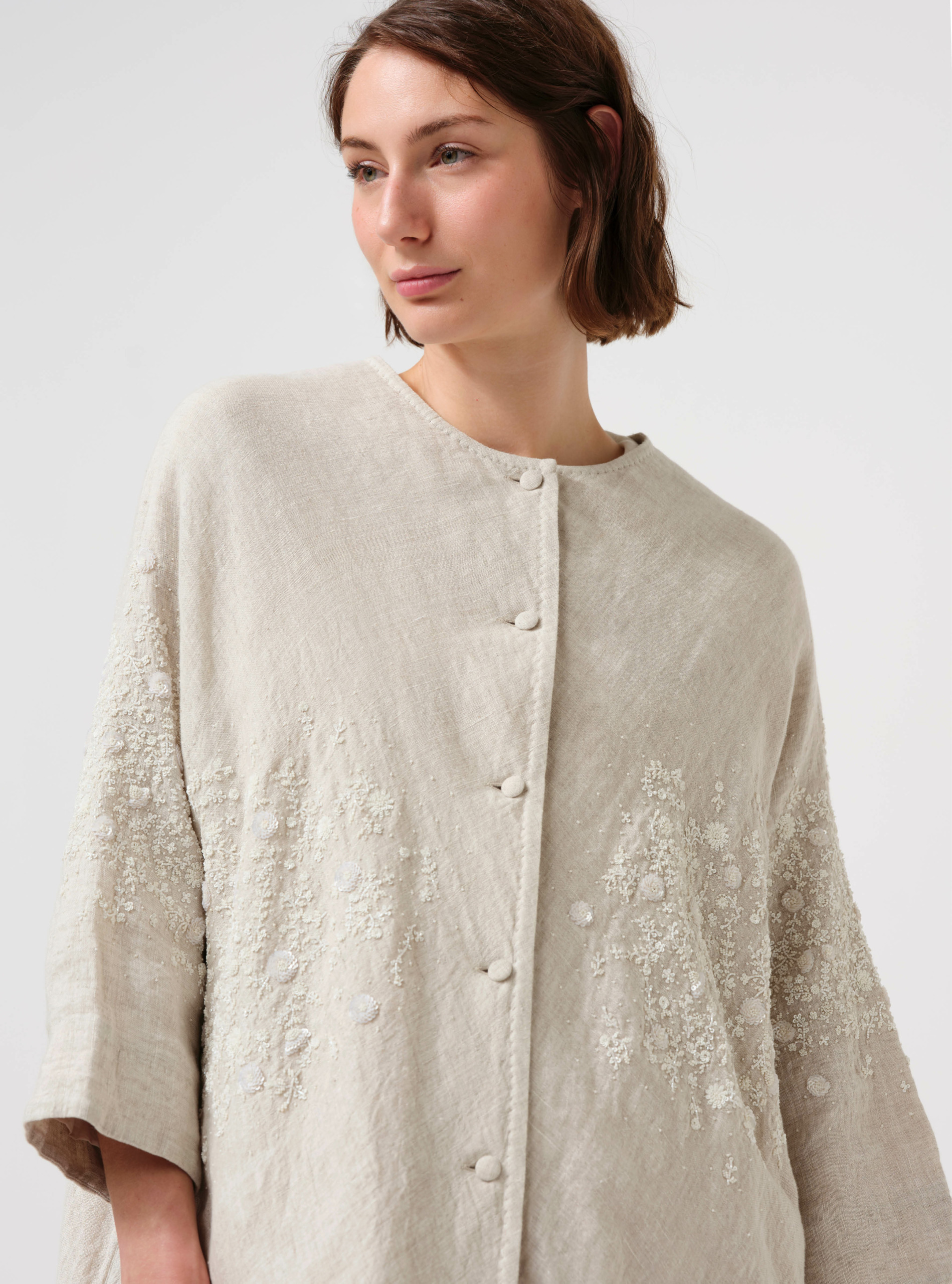 Graphic, almost primitive, blooms thread across the handwoven linen fabrics via delicate beading and tonal sequins. Often using the same color for both embroidery and fabric, the achieved textural effect is subtle, but mesmerizing. Like taking in Van Gogh’s Sunflowers, one glance is not enough—it takes several moments of longing to fully appreciate the depth and complexity of the maker’s hand.