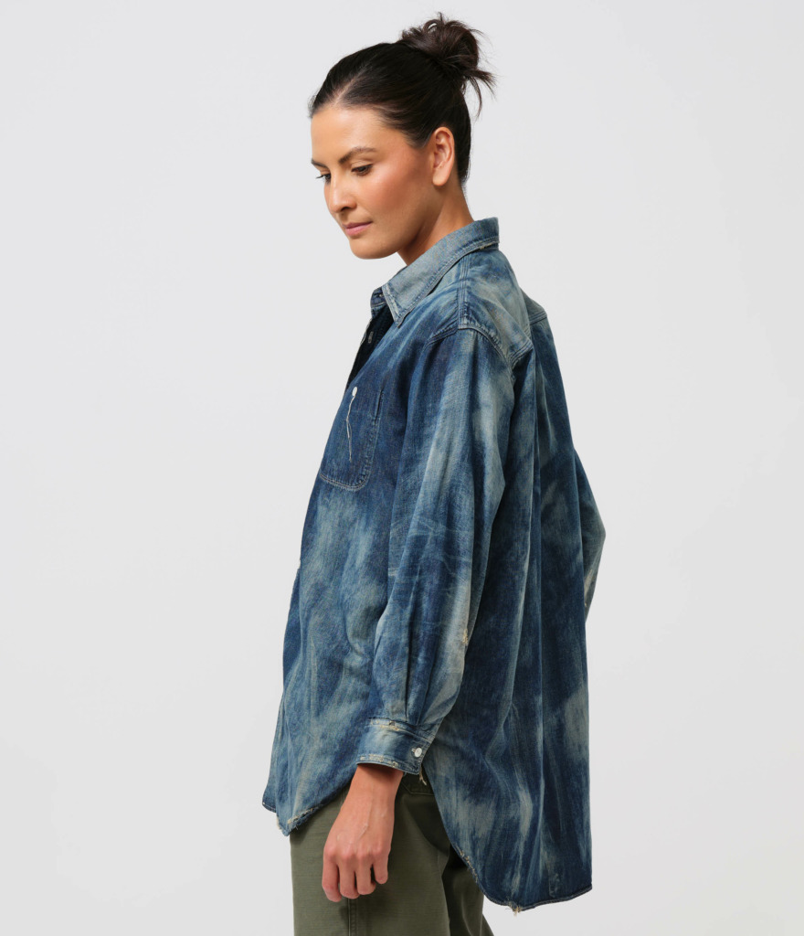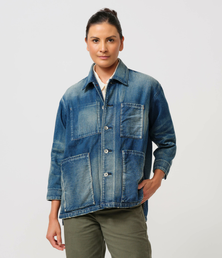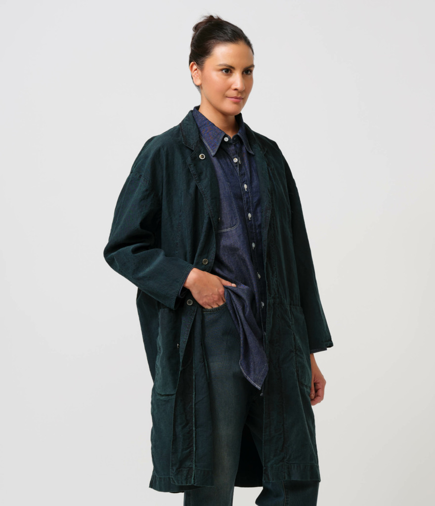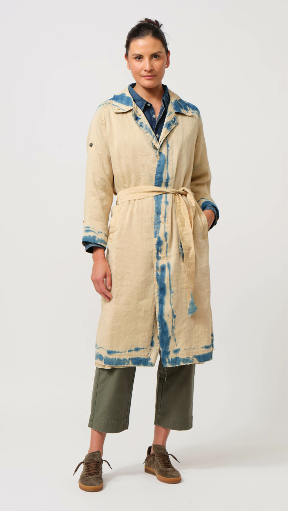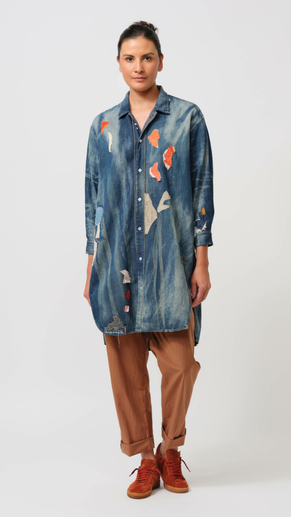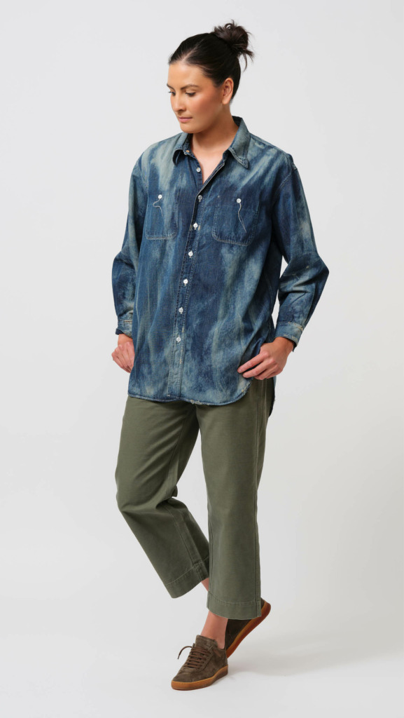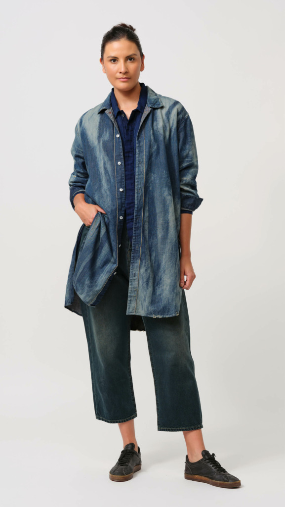 Toshiaki is known for using traditional materials as a guide and taking them in new directions. Working with a fabric called “itto unsai” that was originally used to make tabi socks, Toshiaki experimented to create a similar hemp cotton fabric that could work for clothing. This old-meets-new fabric has a textured finish with the sturdiness of 100% cotton.