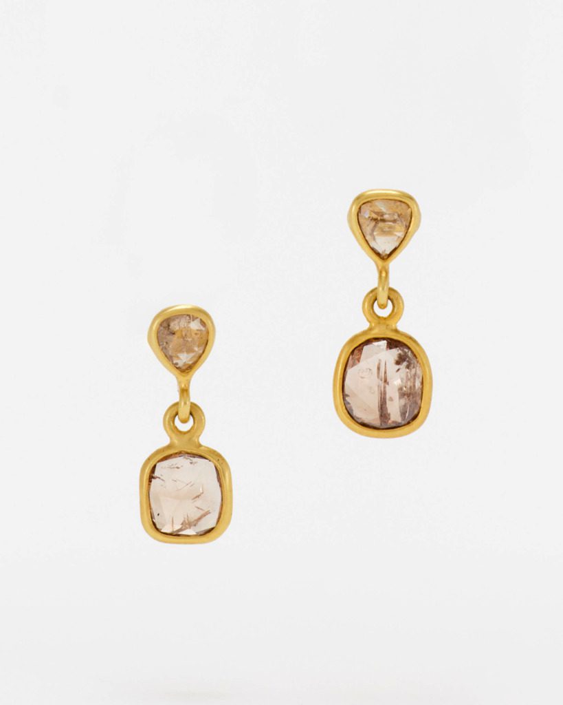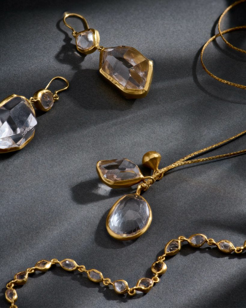 18K Gold ‘Metamorphic’ Double Drop Earrings with Herkimer Diamonds (Top), 18K Gold ‘The Middle Path’ Bracelet with Spinel & Diamonds (Middle), 18K Gold ‘Beira’ Bracelet with Herkimer Diamonds (Bottom)