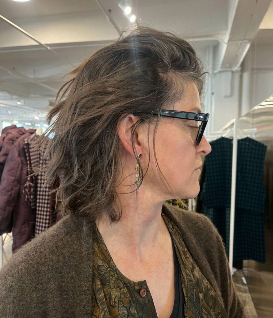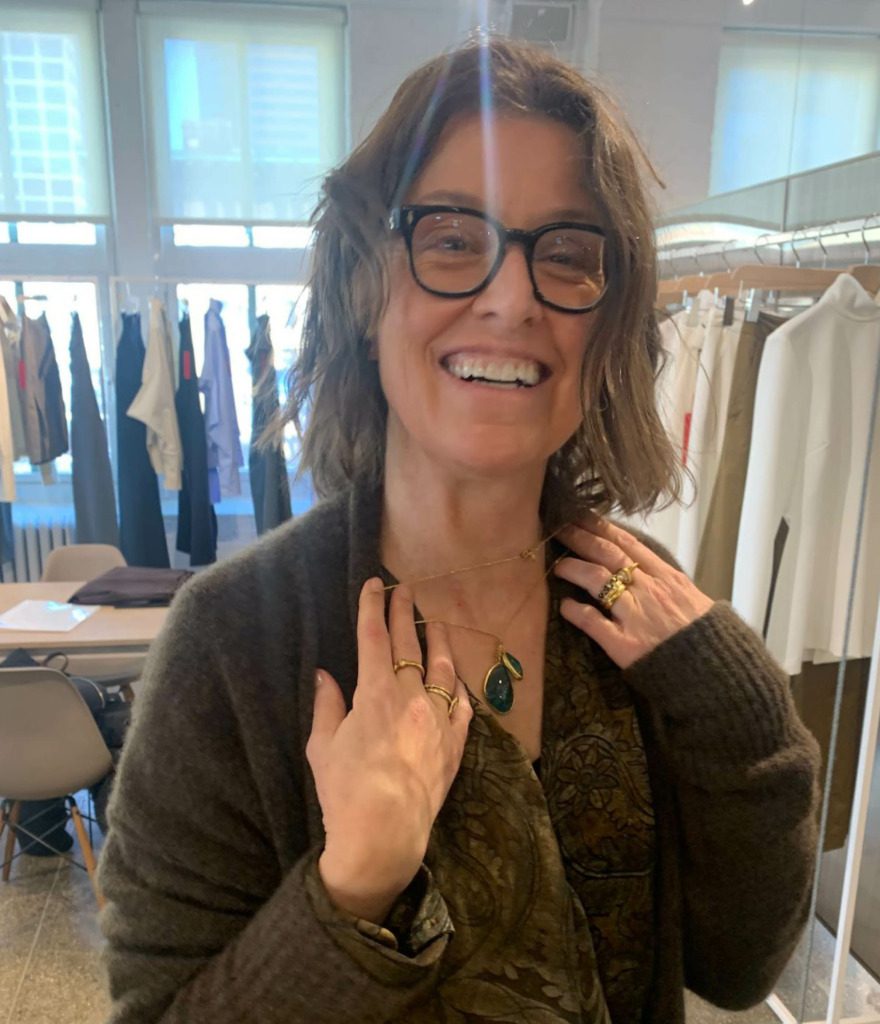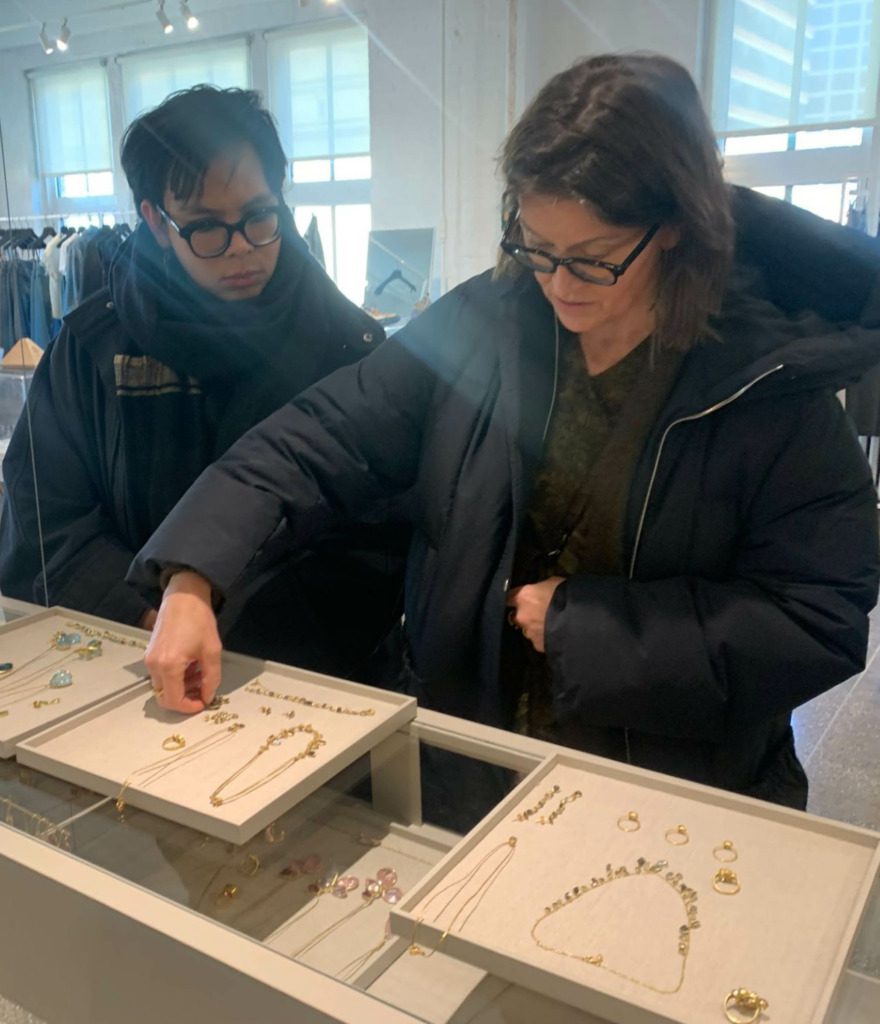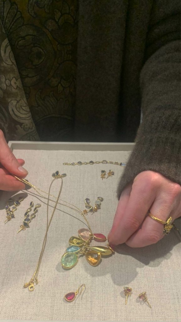 Pippa’s buy is always a pleasure. Her cases are a candy store of stones sorted by color, ranging from glimmering peridots and dark spinel to bright diamonds and soft aquamarine. Each case in her showroom is suspended from the ceiling, wobbling back and forth sweetly as we work through the pieces on offer. We ultimately followed the stones here, opting to bring in a wide selection of smaller blue, black and grey pieces that would work well as we move into fall. Of course we couldn’t resist also snagging a few of her signature tumbled gem pendants… find these in tourmaline, crystal quartz and a near luminescent aquamarine.