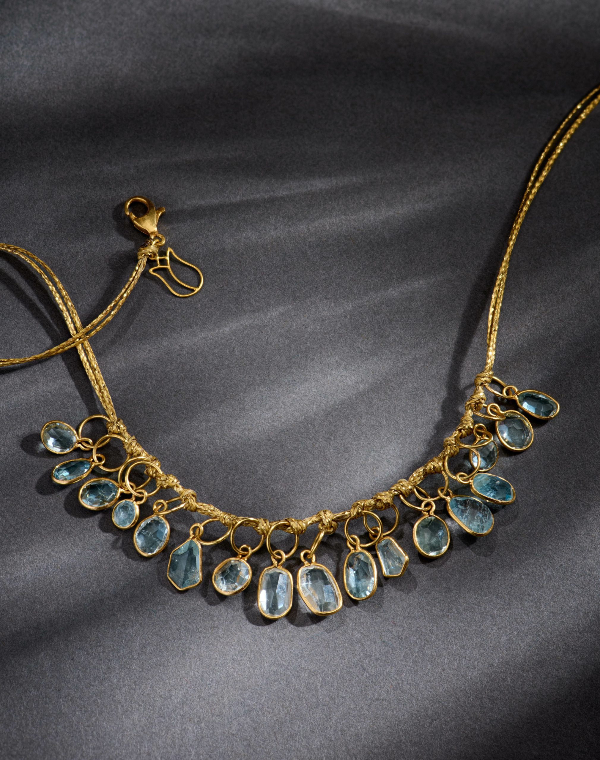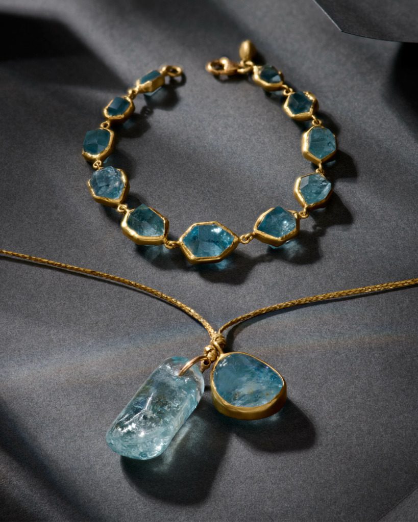 18K Gold & Hexahedral Aquamarine Bracelet (Top), 18K Gold Cord Aquamarine Double Pendant Necklace (Bottom)