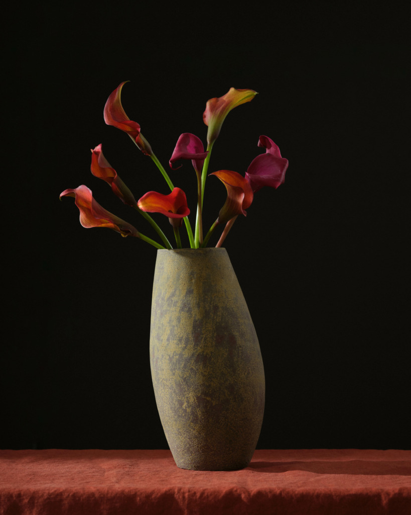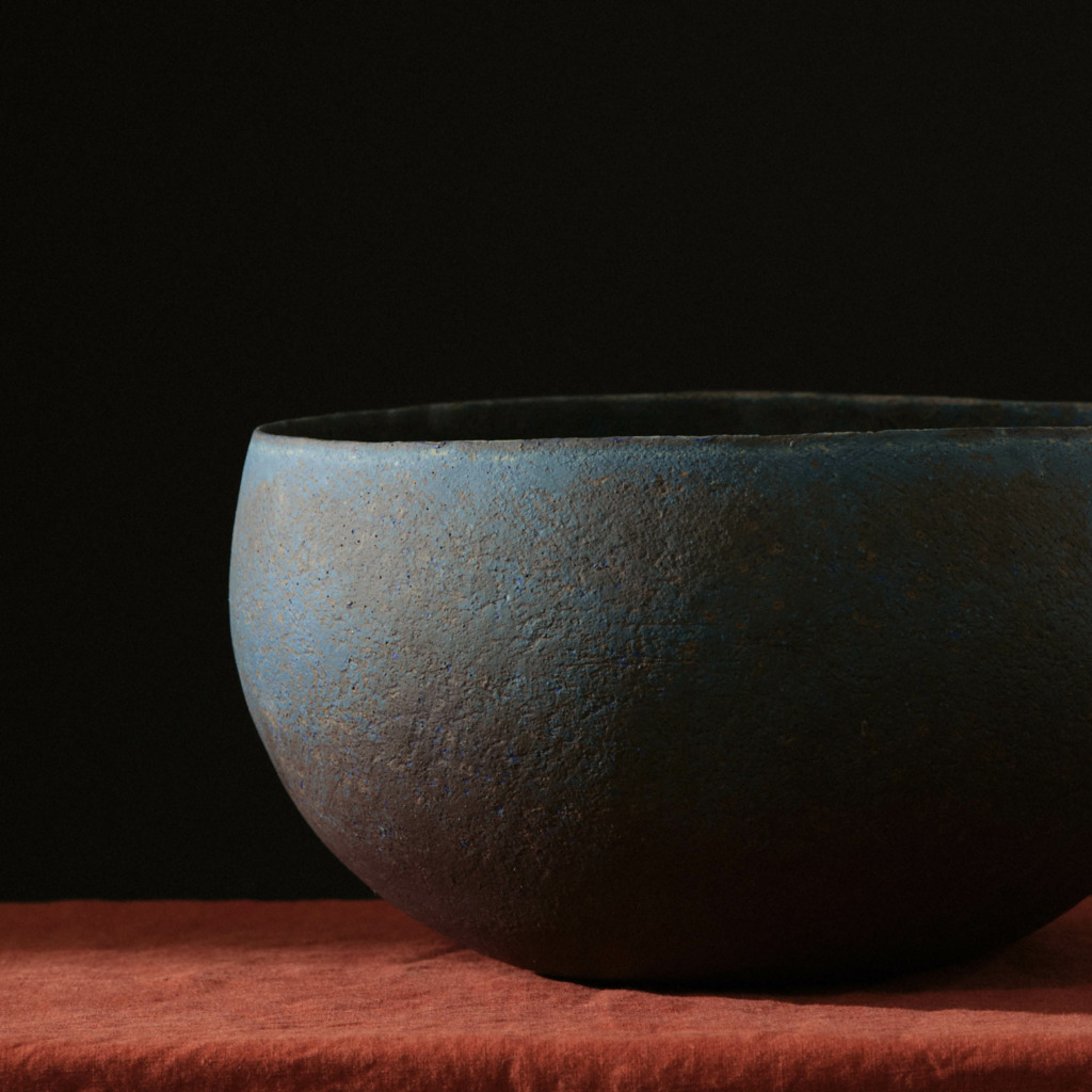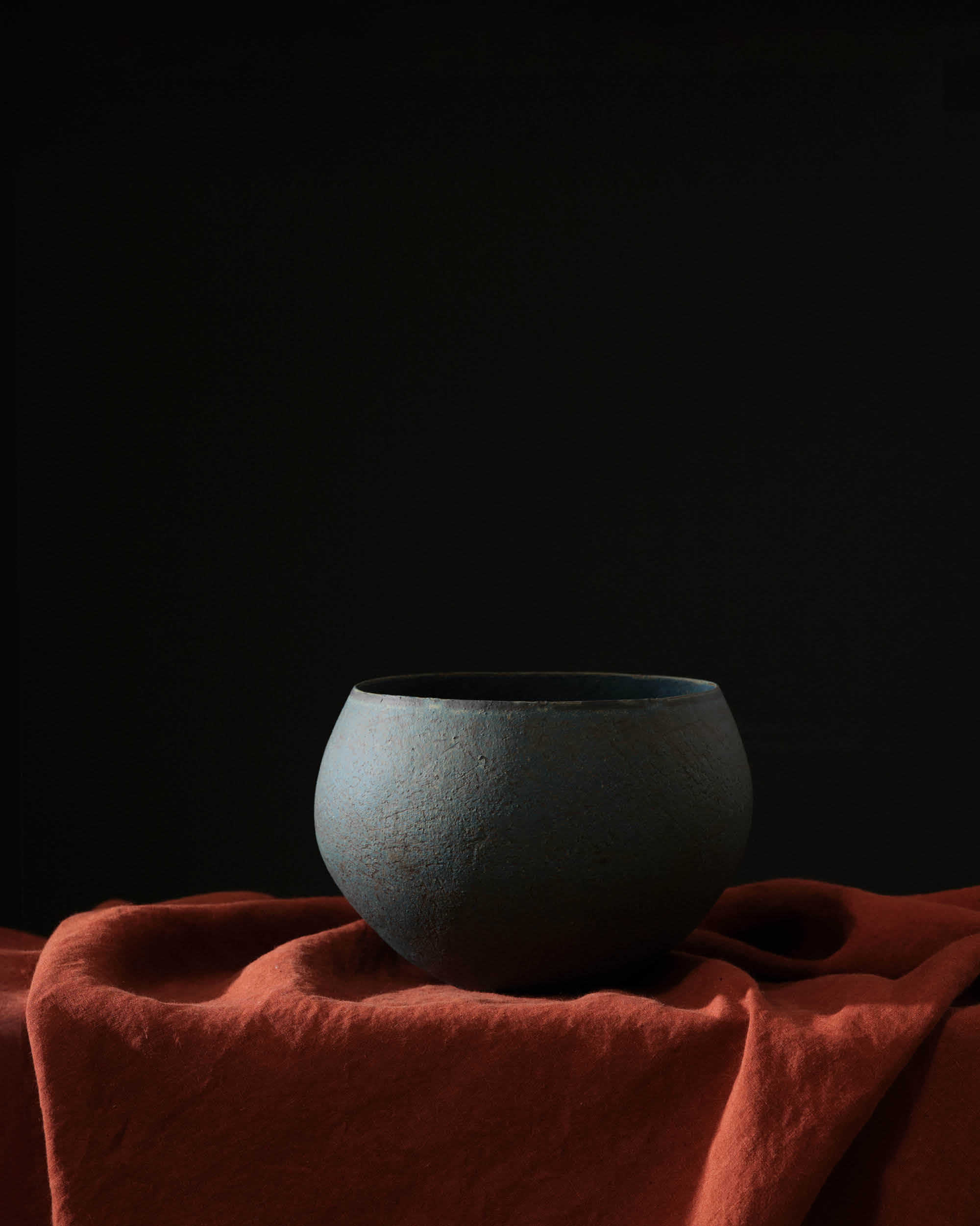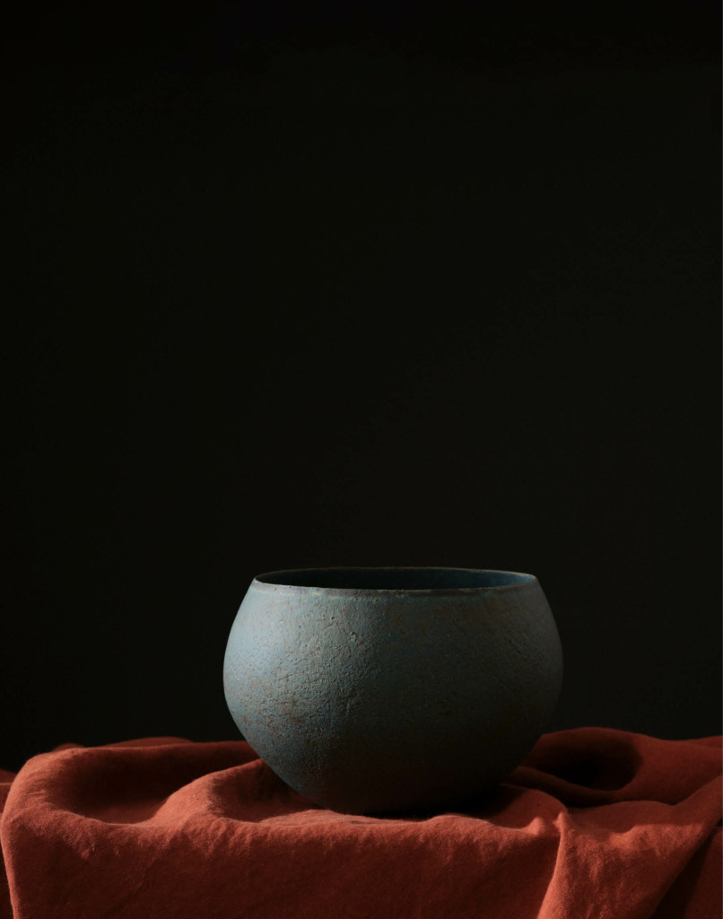 Though her forms are nothing short of incredible, what most strikes us are Linda Ouhbi’s hyper-tactile finishes. At first brush, the pieces seem to be hewn not from clay, but from rock, granite, metal – materials associated with the fortitude of architecture and spirit alike. This effect is achieved through a careful layering of mineral glazes, oxides and slips, followed by deliberate hand-carving. Linda Ouhbi achieves a “used” patina through this practice, as if each piece has already stood for a millennia, and may stand for a millennia more.