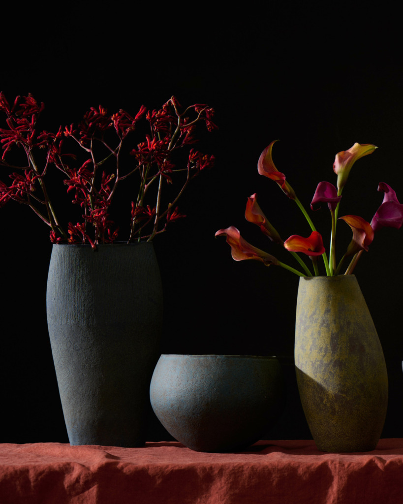 With each movement at her artist’s bench, Linda Ouhbi develops a dialogue between the surface of her vessels and the space they occupy. A tacit conversation emerges through this instinctive creation; a swell of clay at the base, bubbling lilts; an upward curve, rising ideas; a sudden edge, deliberate repartee.